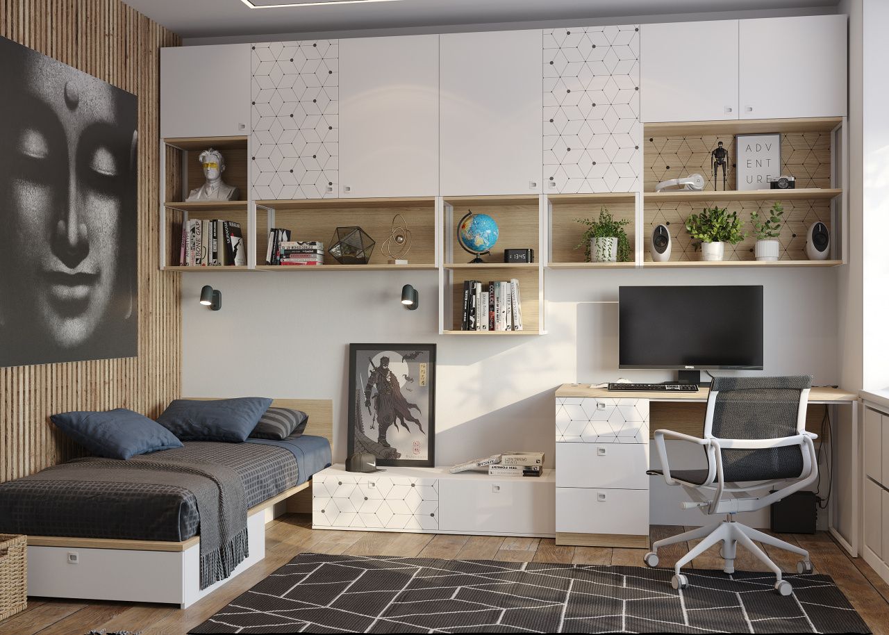Вся стена над рабочей поверхностью и кроватью оборудована подвесными полками, стеллажами с открытыми и закрытыми секциями
