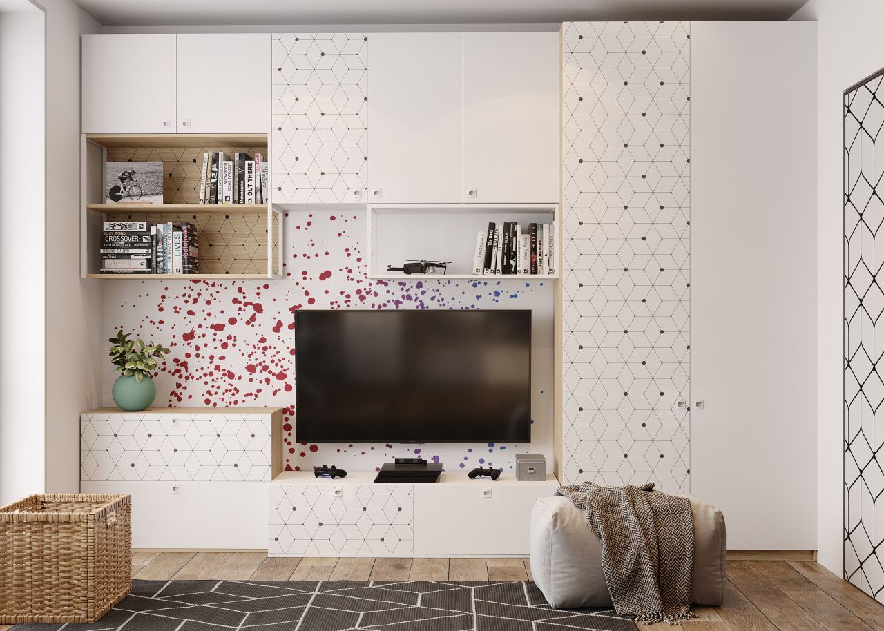 ТВ-зона с вместительными модулями для хранения вещей, книг.