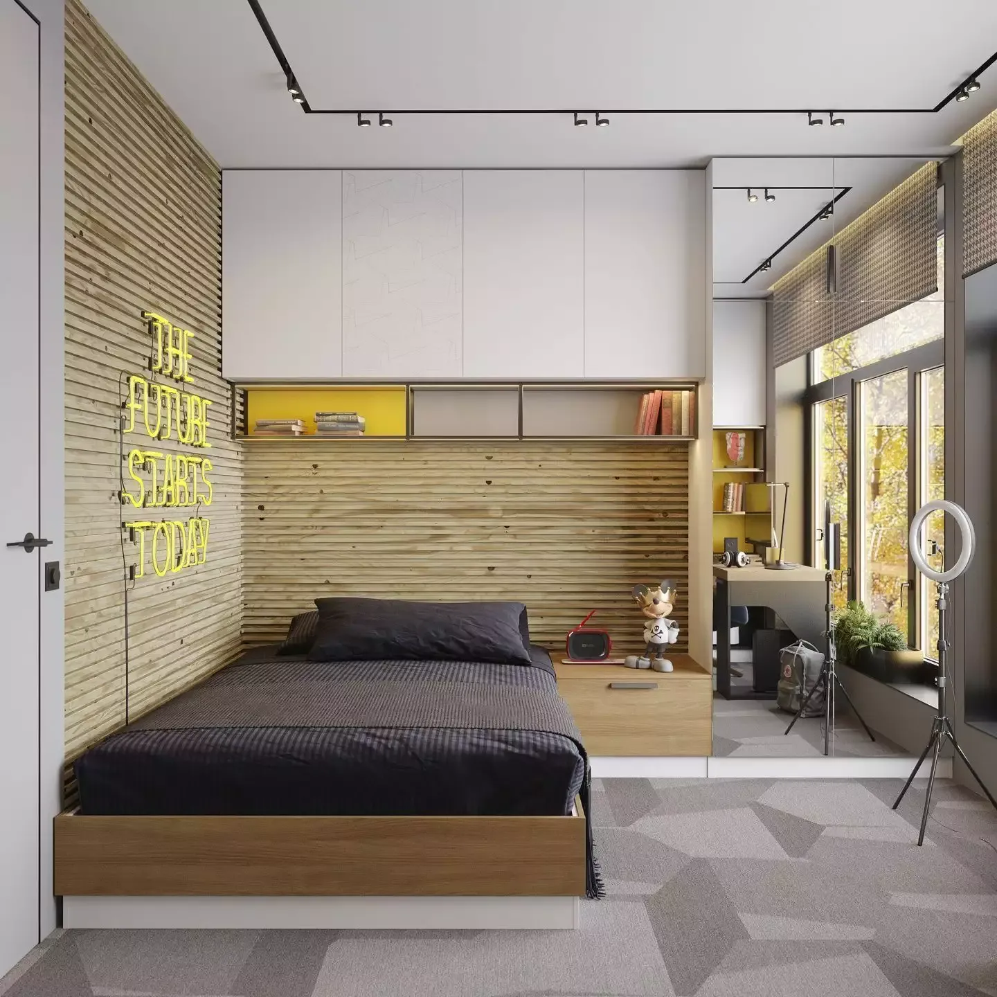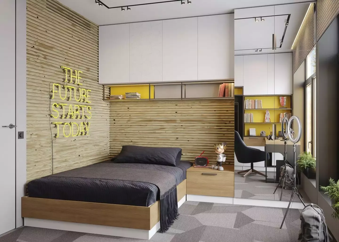 Подростковая спальня сделана в светлых и ярких тонах с темными акцентами. Мебель выполняет две главные функции: создает в комнате уютную атмосферу и позволяет грамотно распределить вещи, поддерживать помещение в чистоте.