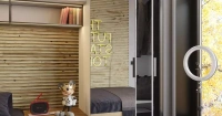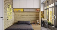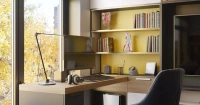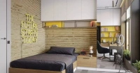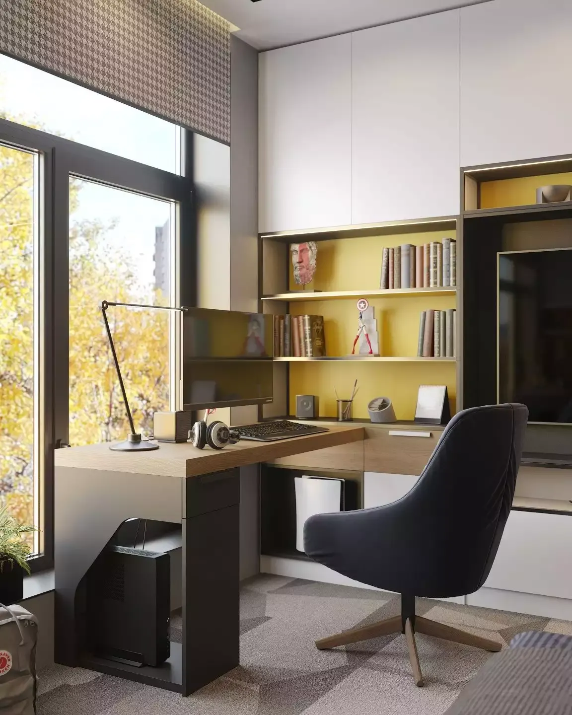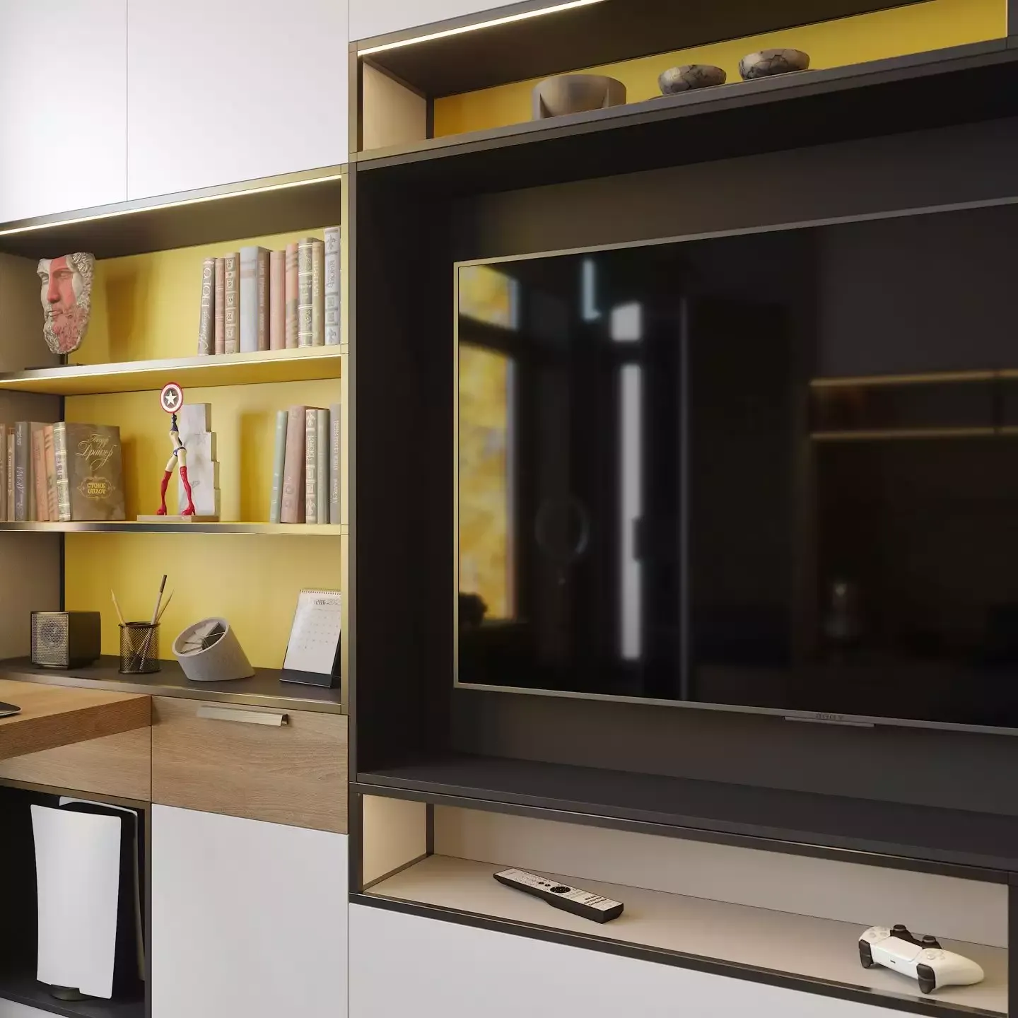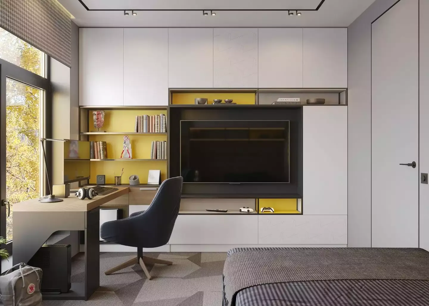 Основной акцент сделан на сочетание белого декора "Алебастр" с желтым Эмаль RAL (1023). Для создания корпуса использованы также декоры “Графит” и “Гейнсборо”. Такая комбинация цветов и оттенков делает комнату одновременно удобной и современной, а черные акценты только оттеняют светлые тона и придают стильный вид обстановке.
