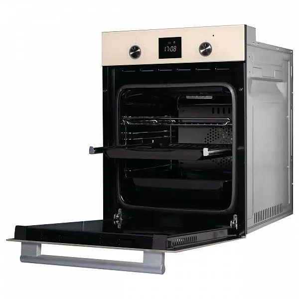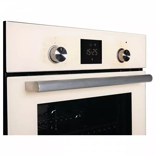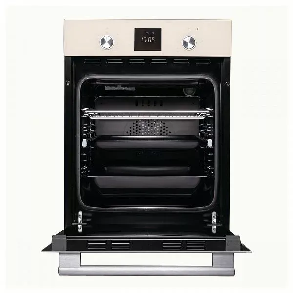 Духовой шкаф с сенсорным электронным управлением TouchControl, ширина 45 см, LED дисплей Cold White белого цвета, панель управления - бежевое стекло, 9 режимов нагрева, объем духовки 45 л, телескопические направляющие на одном уровне, утапливаемые переключатели, двухслойное остекление, каталитическая очистка, автоматическое отключение, в комплекте: 2 противня и хромированная решетка, цвет: бежевое стекло.