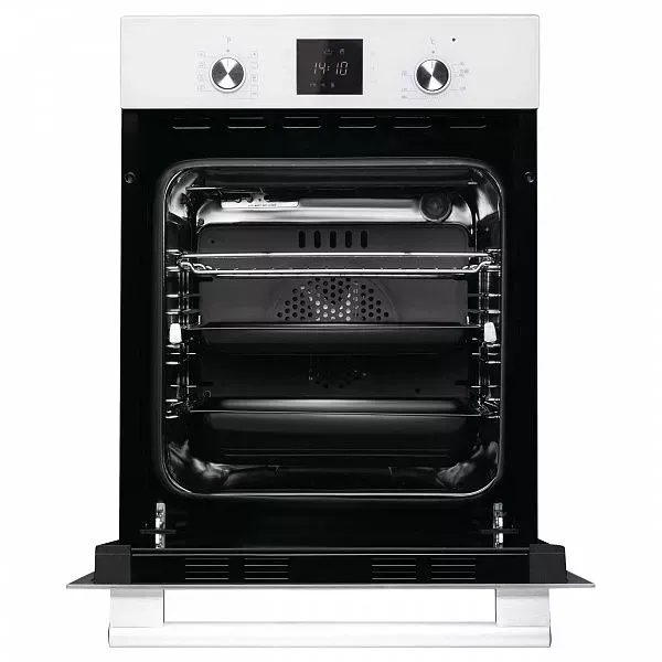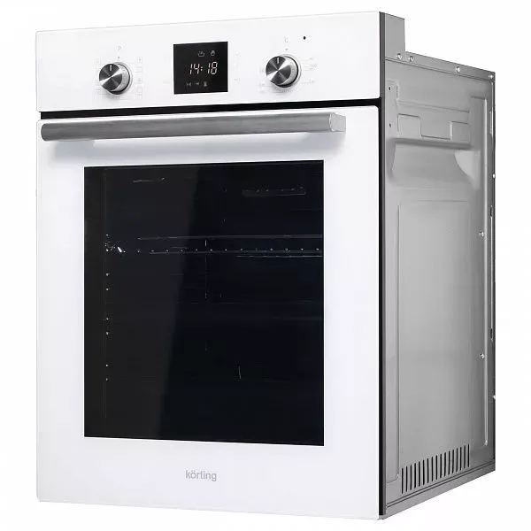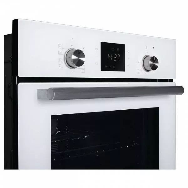 Духовой шкаф с сенсорным электронным управлением TouchControl, ширина 45 см, LED дисплей Cold White белого цвета, панель управления - белое стекло, 9 режимов нагрева, объем духовки 45 л, телескопические направляющие на одном уровне, утапливаемые переключатели, двухслойное остекление, каталитическая очистка, автоматическое отключение, в комплекте: 2 противня и хромированная решетка, цвет: белое стекло.