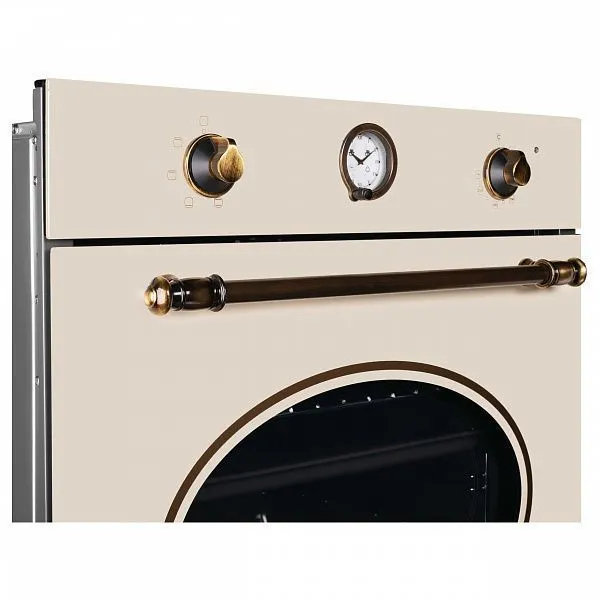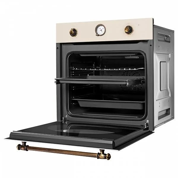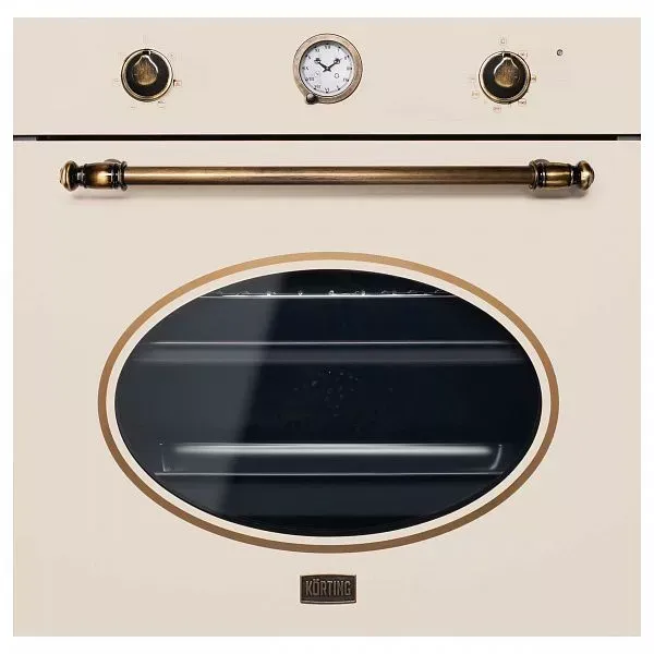 Духовой шкаф в ретро-дизайне, аналоговые часы с функцией времени, таймера и отключения, 6 режимов нагрева, объем духовки 64 л, телескопические направляющие на одном уровне, двухслойное остекление, каталитическая самоочистка, автоматическое отключение, металлический шильд с логотипом Korting, в комплекте: глубокий противень, противень для выпечки, хромированная решетка, цвет - слоновая кость; цвет ручки и регуляторов - золото.