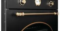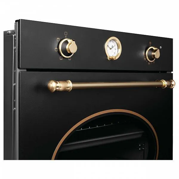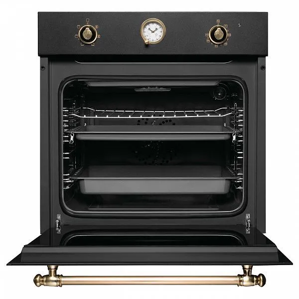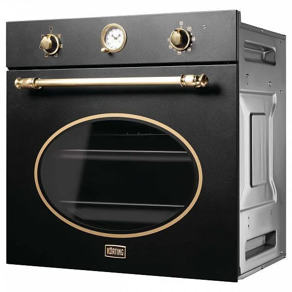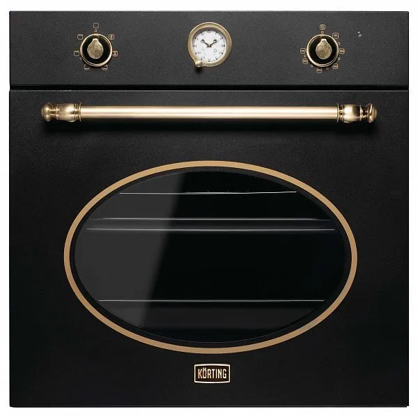 Духовой шкаф в ретро-дизайне, аналоговые часы с функцией времени, таймера и отключения, 6 режимов нагрева, объем духовки 64 л, телескопические направляющие на одном уровне, двухслойное остекление, каталитическая самоочистка, автоматическое отключение, металлический шильд с логотипом Korting, в комплекте: глубокий противень, противень для выпечки, хромированная решетка, цвет - черный; цвет ручки и регуляторов - золото.