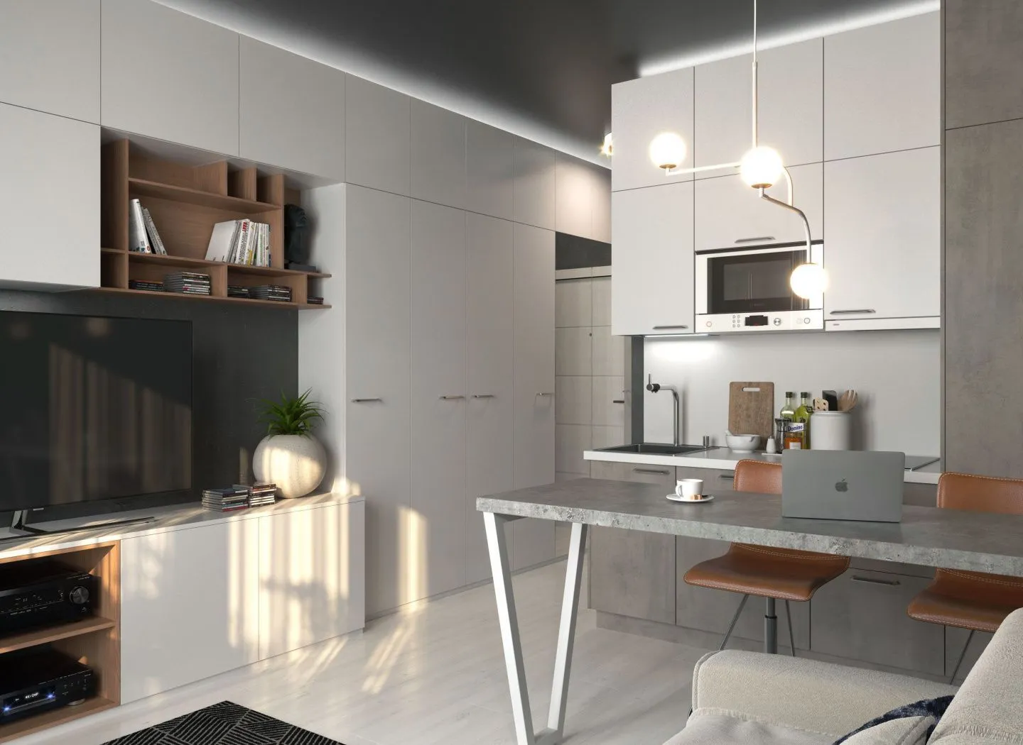 Объединенная зона прихожей и гостиной является многофункциональной системой хранения и объединяет в себе множество секций с полками, два шкафа для одежды. Модуль для гостиной включает в себя ТВ-юнит и тумбы для размещения аудио-видео техники. Мебель занимает немного места, но при этом предлагает отличные возможности для хранения вещей. Проект полностью вписан в габариты помещения.