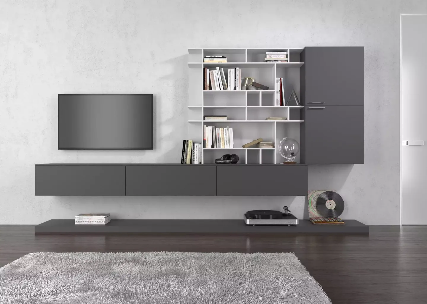 Компактный ТВ-юнит для гостиной из коллекции DaySystem в серых тонах. В основном состоит из подвесных элементов: стеллажа, шкафа и консольной тумбы. Под ними смонтирован подиум, на котором можно разместить аудио-видео технику, книги и другие вещи. Белый стеллаж имеет множество отделений разной формы. Мебель надежно закреплена на стене. Композицию можно установить зеркально.