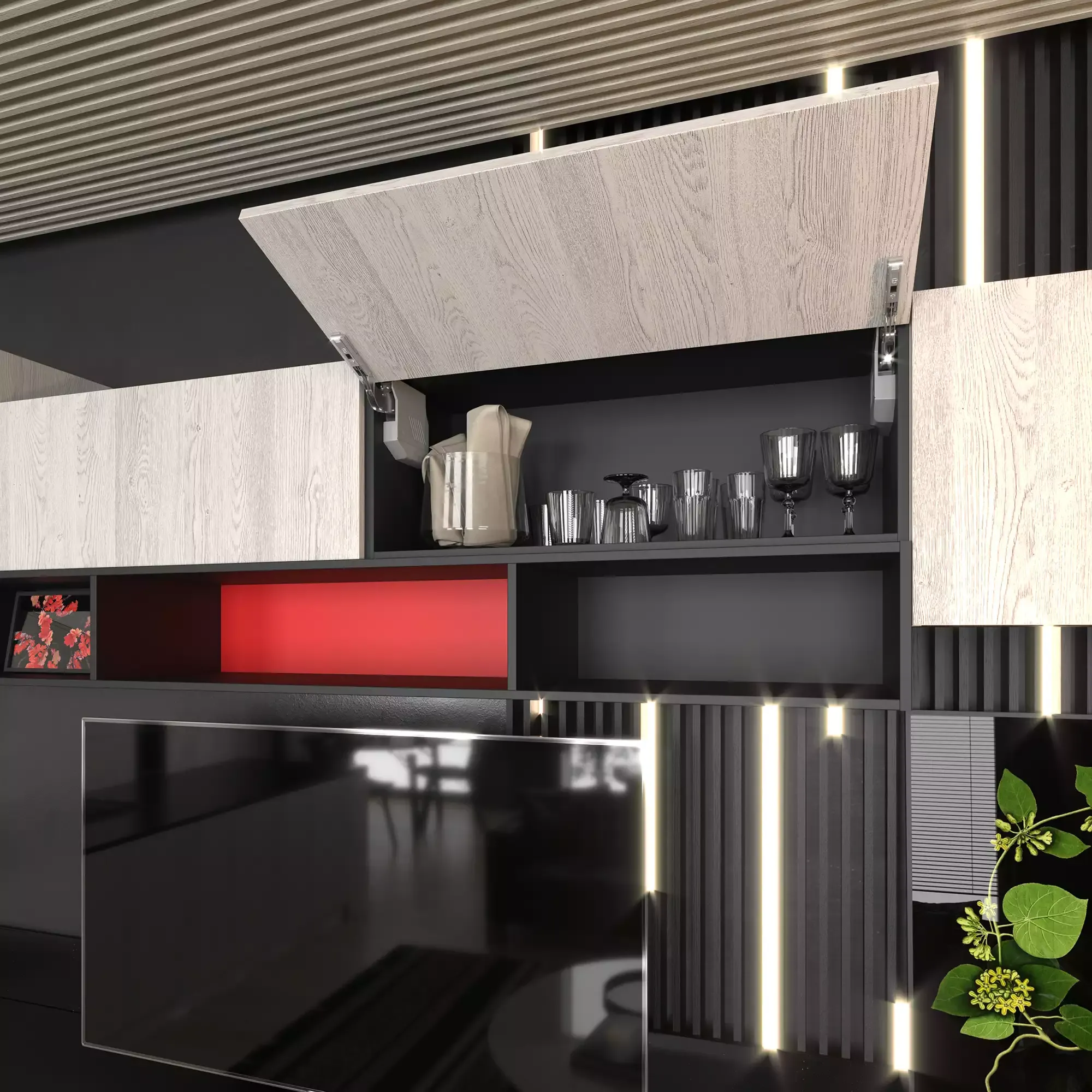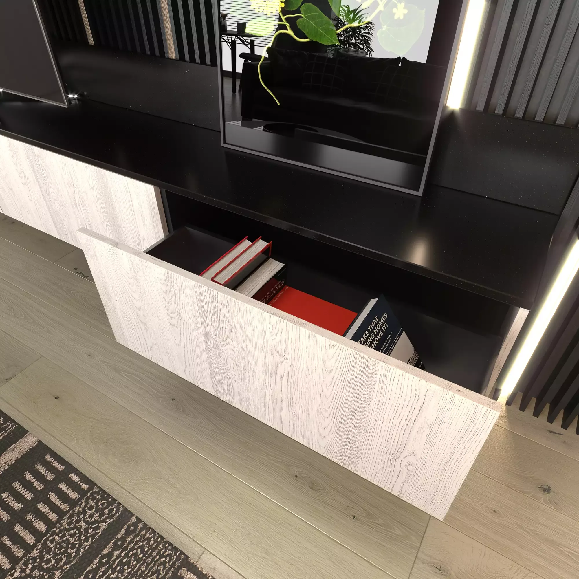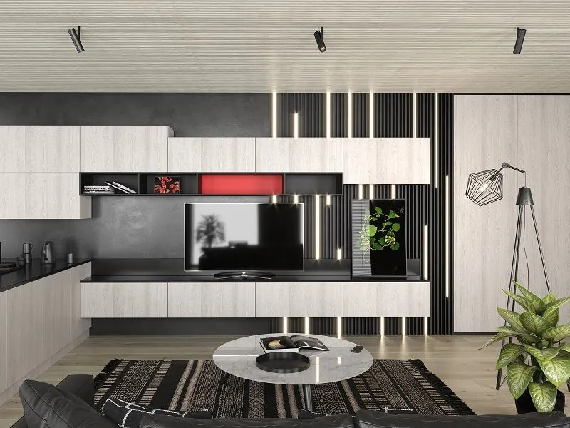 Гостиная со столешницей под ТВ из искусственного камня подойдёт и для просторной комнаты, и для большой студии. Корпус выполнен из ламинированной плиты чёрного цвета и выглядит очень эффектно на контрасте с декором фасадов. Они, в свою очередь, созданы из структурированной плиты «Дуб Гладстон белый» по программе Feelwood: эта технология позволяет делать материал, структура которого идеально имитирует поверхность натурального дерева.