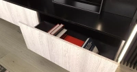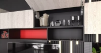 Закрытые шкафы в верхней и нижней части открываются по нажатию: система Push to open позволяет сохранить фасад гладким, избавив его от выступающих ручек. Механизм крепления позволяет фиксировать поднятые вверх дверцы в открытом положении.