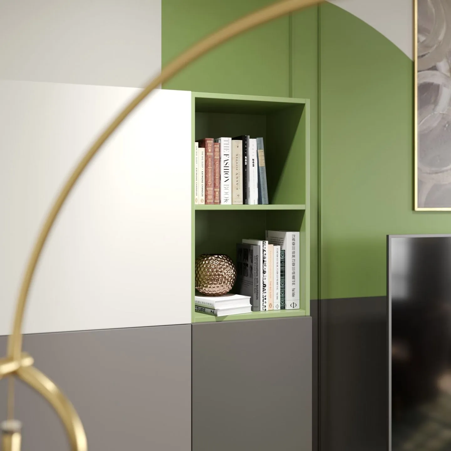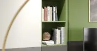 Открытые полки подходят для хранения книг и сувениров, а компоновка блоков определяется во время разработки оригинального дизайн-проекта.