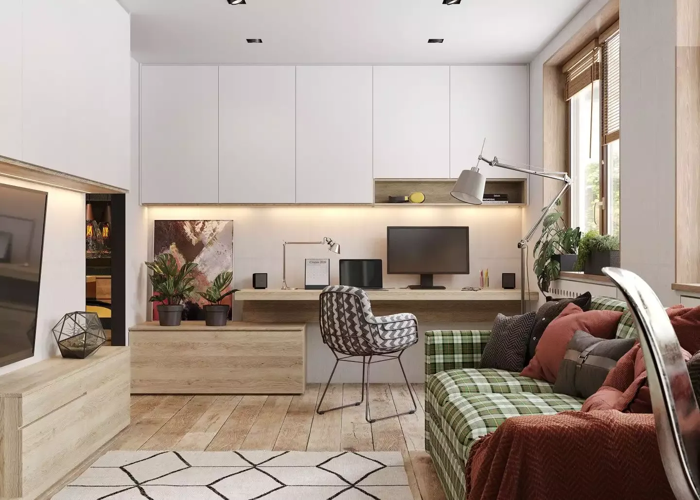 Зона гостиной в небольшой квартире-студии. В этом проекте очень компактно и функционально удалось разместить сразу несколько решений: