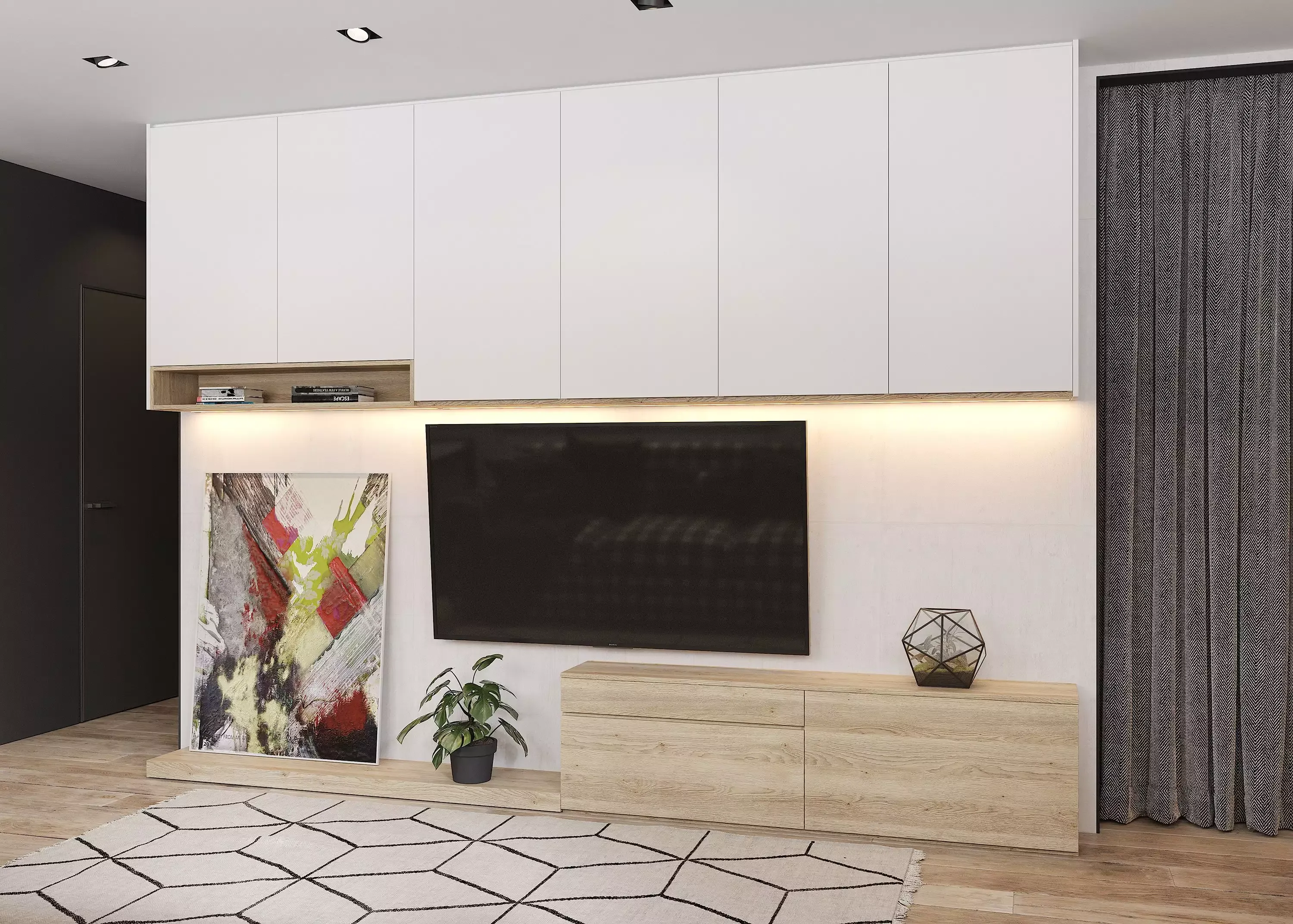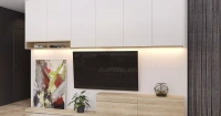 Этот проект является решением для гостиной под ключ. И как вы уже убедились, включает в себя все самое необходимое. Если вам нравится декор под натуральное дерево, вы можете остановиться на этом оформлении, нет -  просто скажите об этом нашим дизайнерам. Они с готовностью подберут варианты с учетом особенностей вашего ремонта, освещения в комнате. Ждем вас!