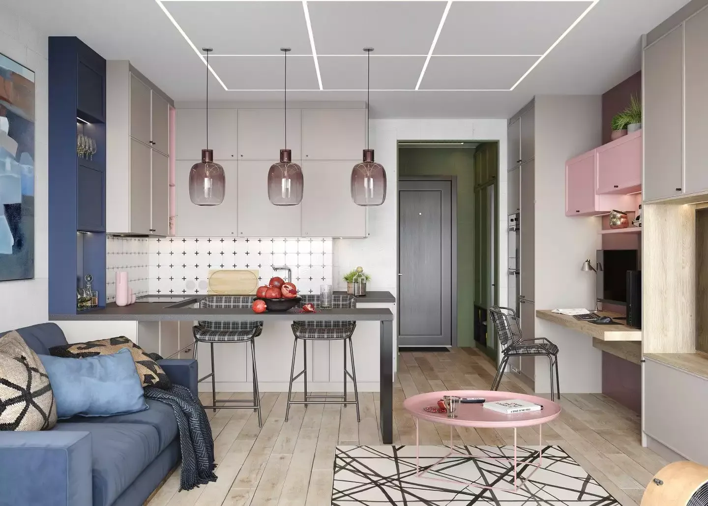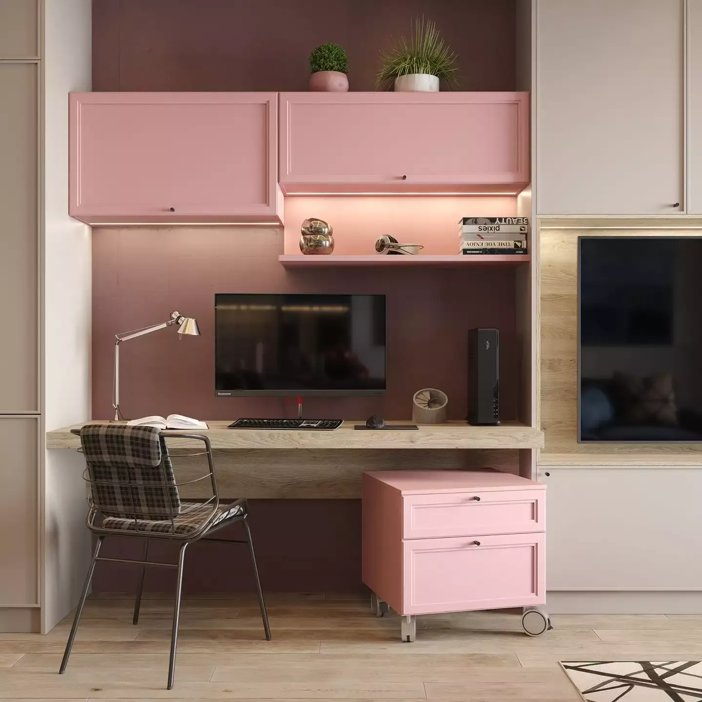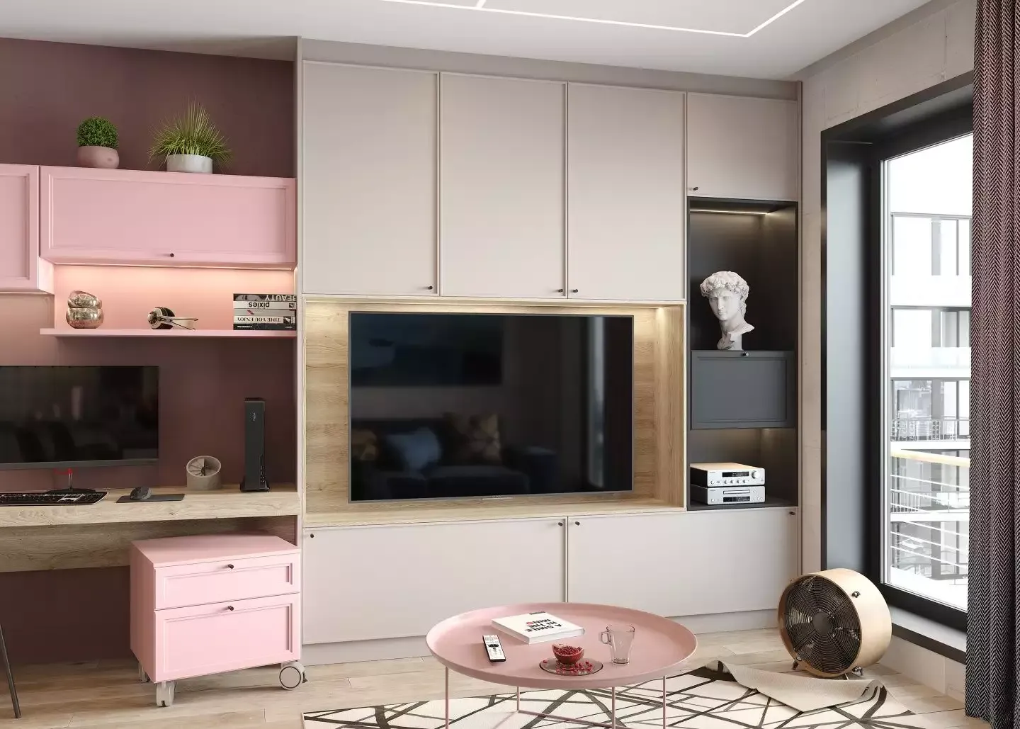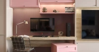 Для создания мебели использовано два типа фасадов — «Трей» и «Урбан» с рамой из МДФ разной толщины. Фасады «Урбан» выкрашены розовой эмалью, «Трей» декорированы плёнкой «Урбан Кашемир». Поверхность матовая. Корпус выполнен из ламинированных плит «Кашемир» и «Фламинго», декор подобран точно в тон к фасадам. Ниша для ТВ и консольная столешница толщиной 60 мм выполнены в декоре «Дуб Гладстон» с достоверной имитацией поверхности натурального дерева. Теплая LED-подсветка вокруг ТВ и на открытых полках делает внешний вид мебельного гарнитура более изящным. Фасады снабжены аккуратными маленькими ручками, а также механизмами, которые позволяют зафиксировать откидные дверцы в открытом положении. Открытая секция в декоре «Графит» создаёт необходимый контраст и делает мебель более интересной внешне.