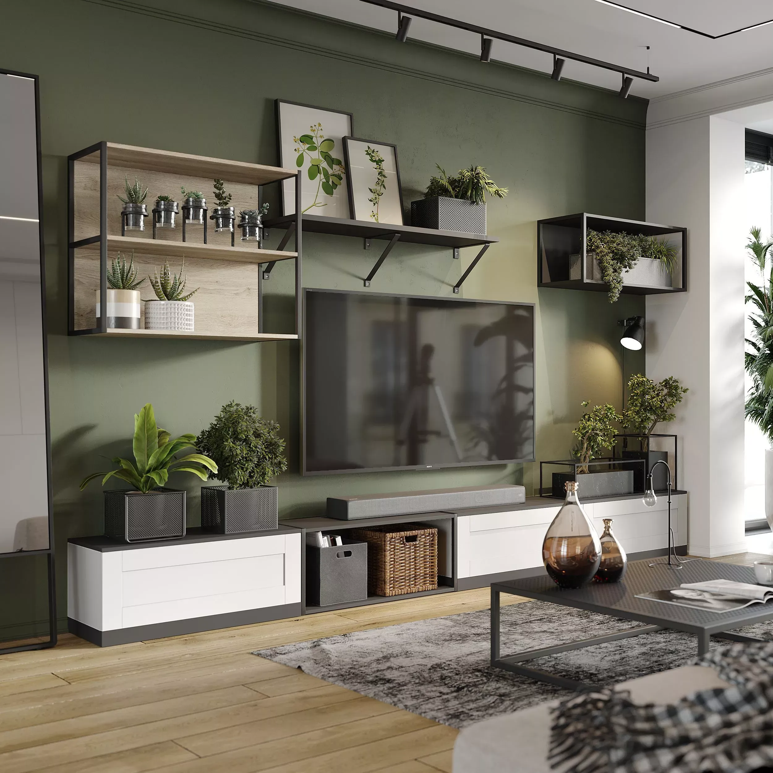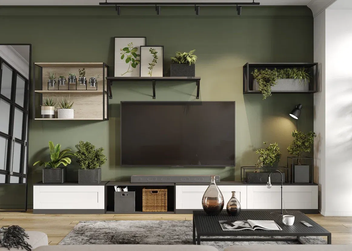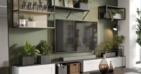 Компактная гостиная в серо-белых и древесных тонах отлично подходит для комнаты молодого человека, для небольшой квартиры и помещения с зонированием. Навесные открытые полки могут использоваться как для книг, так и для компакт-дисков, контейнеров для хранения, документов или комнатных цветов. Сочетание белых и графитовых фасадов с металлическими элементами и древесным декором напоминает о стиле лофт, но подходит для любого современного интерьера. Отличное сочетание функциональности и воздушности вписывается и в минималистичную обстановку, и в комнату с обилием мебели.