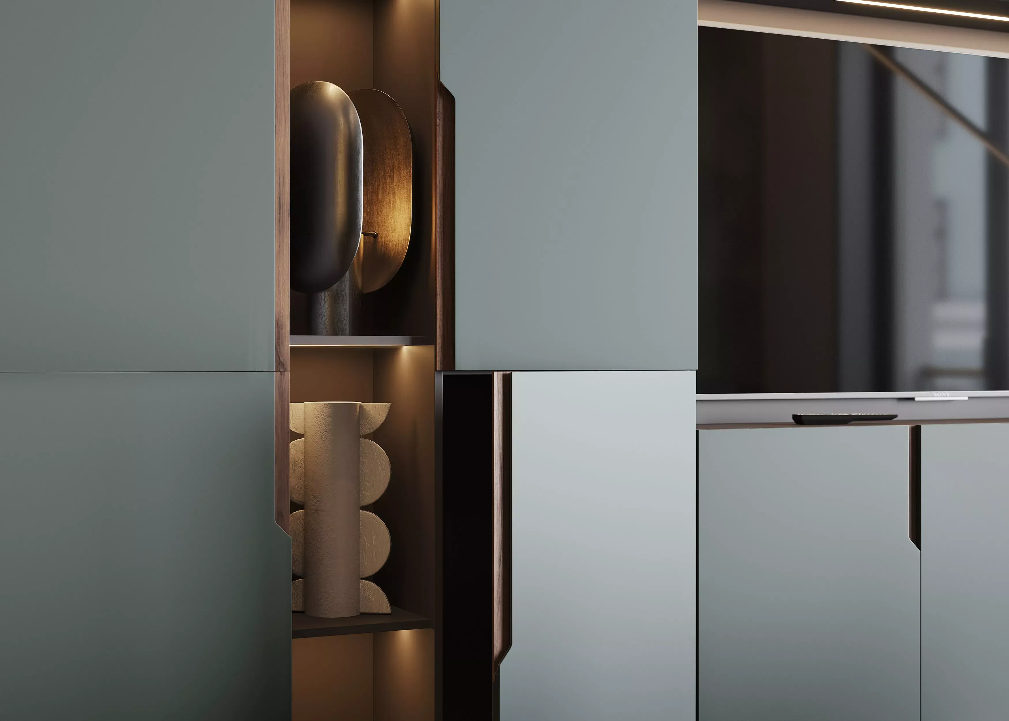 • матовые закрытые фасады — МДФ в декоре «Эмаль NCS»;