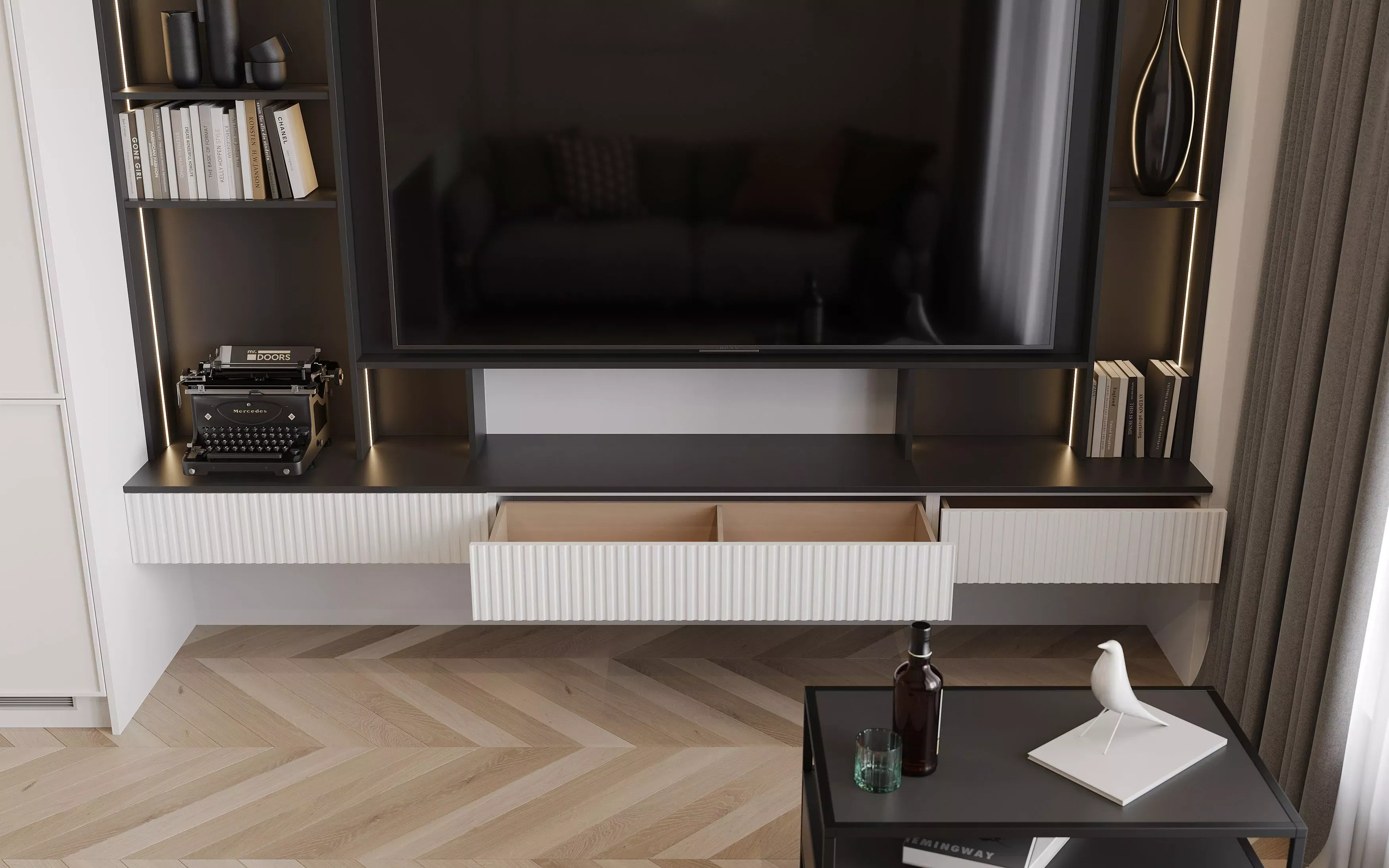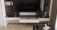 Выдвижные ящики подвесной полки снабжены специальной системой P2O (Push-to-Open – «нажми и открой»), что придает ребристым фасадам лаконичность и законченность.