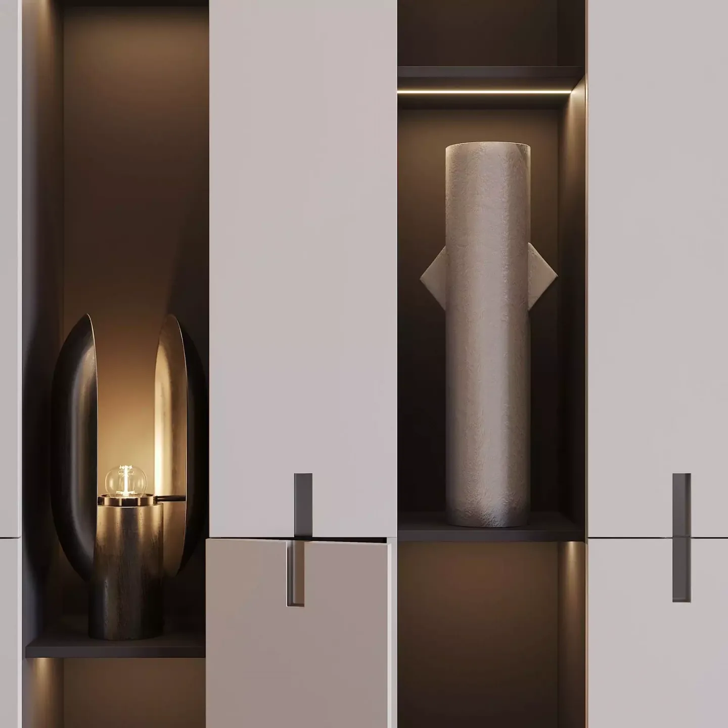 • Он интересно контрастирует со светлыми фасадами, выполненными из МДФ в эмали, в декоре Тауп.