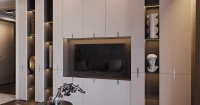 Несмотря на то, что она выглядит очень компактно и не загромождает пространство комнаты, мебель достаточно вместительна и позволяет разместить на относительно небольшой площади удобную систему хранения вещей. Открытые полки чередуются с закрытыми, ручки сделаны так, чтобы не нарушать идеальную поверхность фасадов. Сочетание темных и светлых красок выглядит очень элегантно.