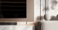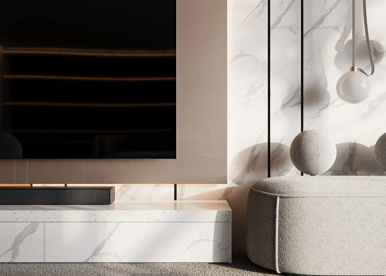 Современная гостиная с акриловой столешницей Granitex 60 мм в декоре A422 Snow Pile. Идеальная гармония стиля и функциональности: массивная столешница из акрилового камня в благородном оттенке Snow Pile добавляет интерьеру лоск и монументальность. Глянцевая поверхность с эффектом натурального камня визуально расширяет пространство, а безупречная белизна создает ощущение свежести и простора. Лаконичные линии, игра света на гладкой фактуре и уютная атмосфера — воплощение современной элегантности.