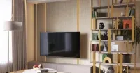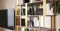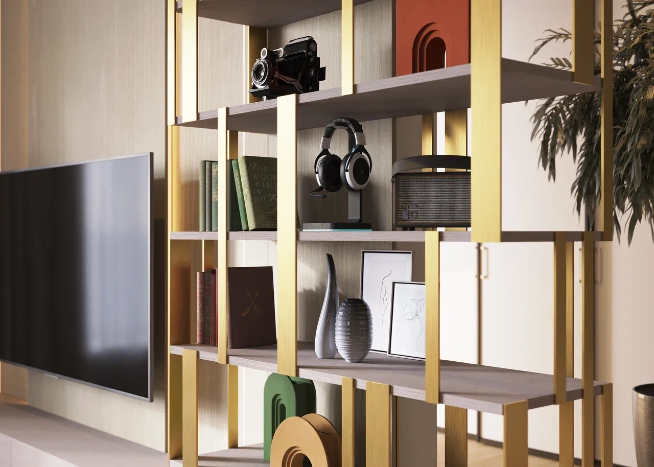 • Стеновая панель шпон 128PT дуб латте и Стеллажные опоры DECO золотого цвета