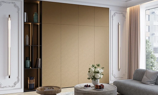 Встроенный шкаф-купе в гостиную изготавливается на заказ. Он не имеет каркаса и помещается в нишах, что позволяет визуально расширить помещение. Из-за отсутствия части корпуса, заказывая такие шкафы, можно существенно сэкономить. Однако стоит помнить, что установив шкаф-купе раз и навсегда, вы уже не сможете его перемещать. Особенно стильно выглядит встроенный шкаф-купе в гостиную во всю стену.