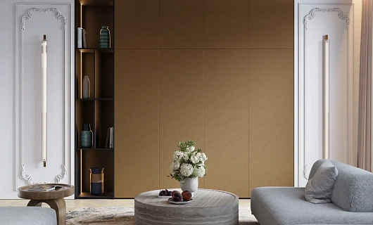 Корпусный шкаф-купе предусматривает наличие задней, передней и боковых стенок, пола и крыши. При желании сделать перестановку мебели в гостиной такие шкафы можно двигать.