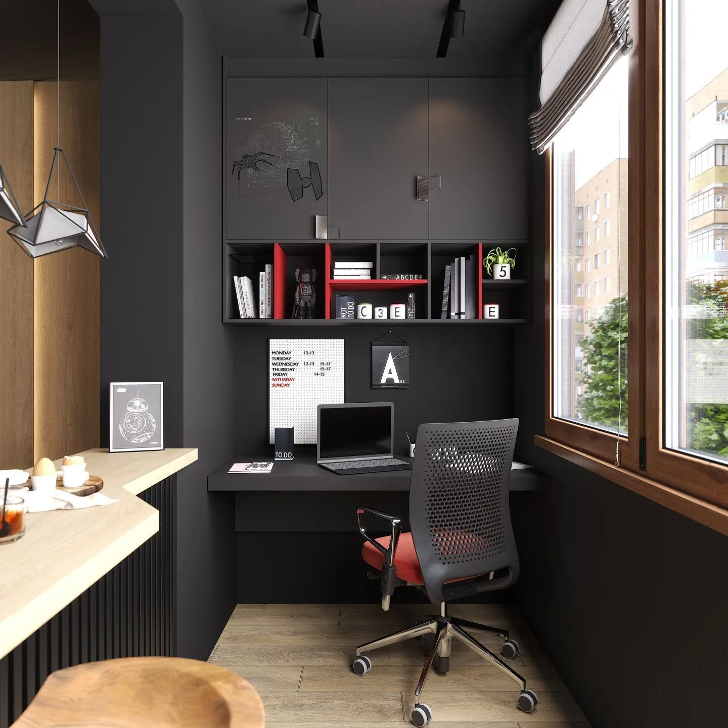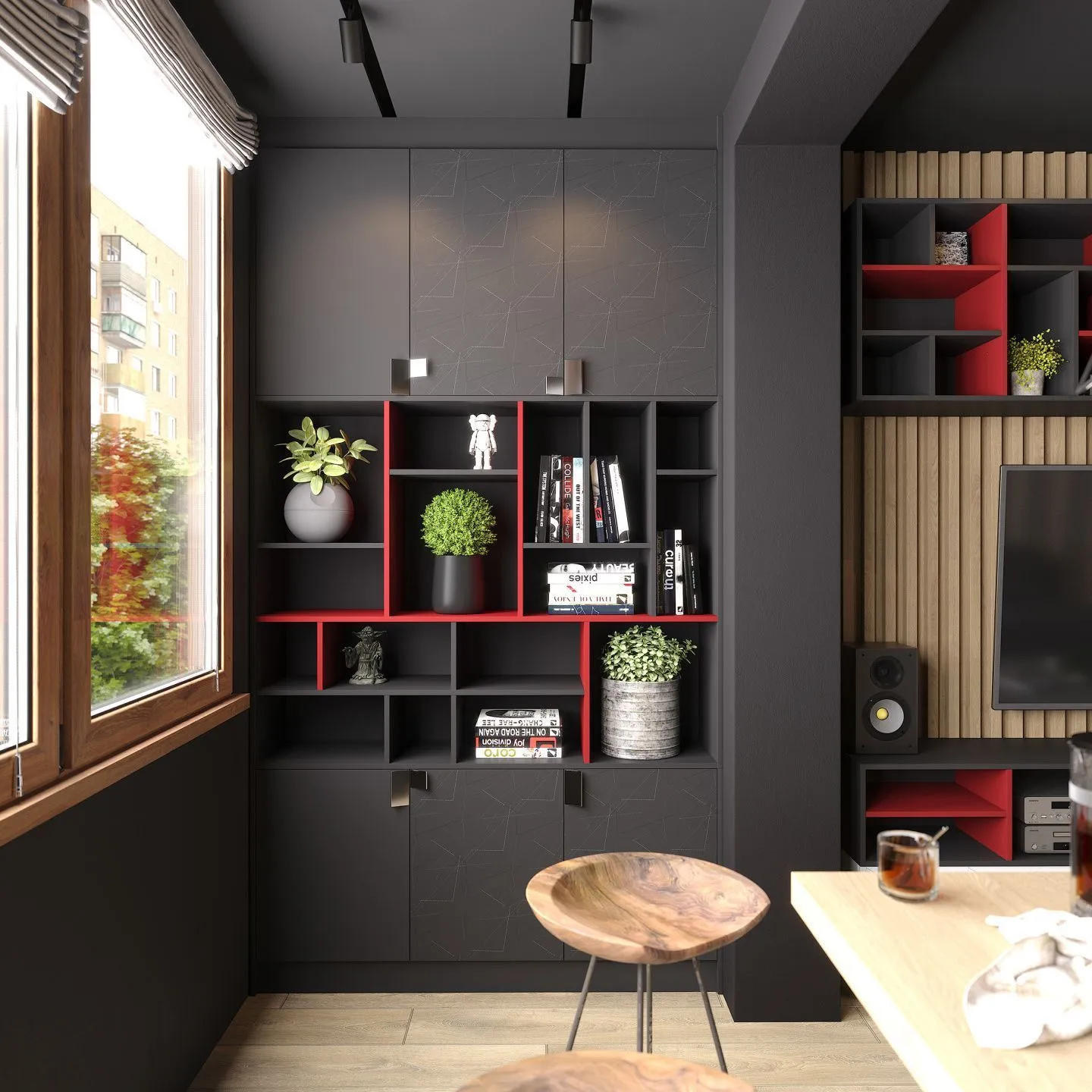 Рабочий кабинет в квартире-студии выполнен в современном минималистичном стиле. Гладкие матовые фасады изготовлены из ламинированной плиты в декоре «Графит» и украшены ручками Zig Zag геометрической формы. Поверхность обработана таким образом, что пыль и отпечатки пальцев на ней почти незаметны: все элементы кабинета удобны в эксплуатации и просты в уходе. Корпус выполнен из ламинированной плиты в декорах «Маки» и «Графит» и образует стилистическое единство с фасадами. Контраст черного и красного цвета – классическое дизайнерское решение, которое добавляет темной мебели изящества.