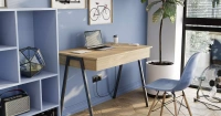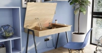 Элегантный письменный стол для рабочей зоны. Его можно расположить в любой комнате, он не займет много места, оставаясь при этом удобным. Изюминкой стола является встроенная система хранения, расположенная под открывающейся вверх столешницей. Там можно разместить документы, записи и другие вещи.