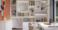 Стеллаж с открытыми полками и закрытыми секциями. Открытые можно задействовать под сувениры, декоративные элементы, книги, а также предметы первой необходимости. Закрытые - для хранения важных документов и того, что редко используется, чтобы не захламлять пространство. В стеллаже используются закрытые фасады 2х типов: сплошные и со стеклянными дверцами. Вариант со стеклом удобен в качестве альтернативы открытым секциям, поскольку, с одной стороны, нужные вам вещи находятся на виду, с другой - они не пылятся слишком быстро.