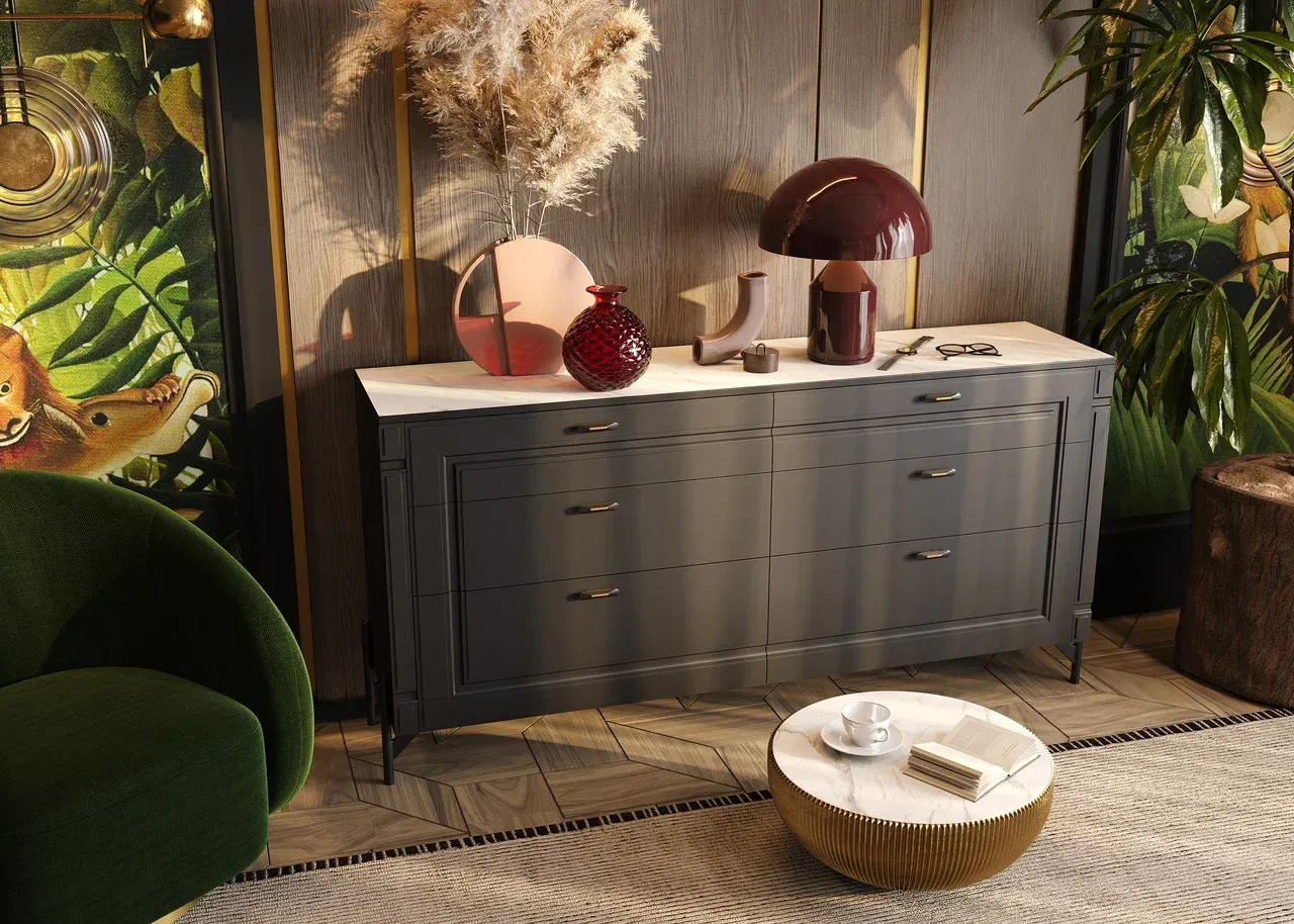 Комод можно изготовить на заказ по индивидуальным размерам. Внутреннее наполнение элементов, а также оформление фасадов и декор могут быть изменены по желанию заказчика.
