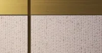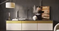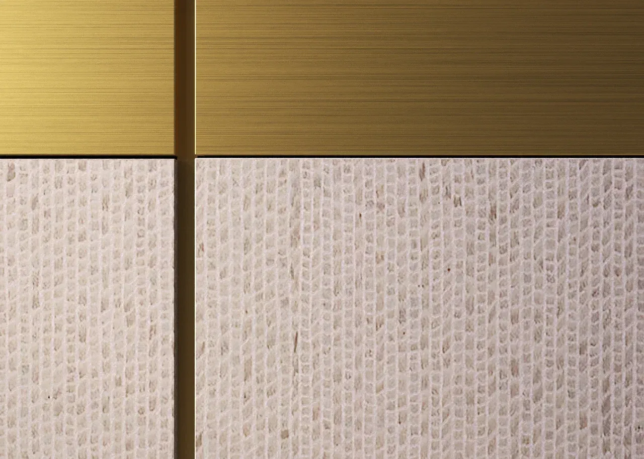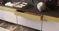 Нижние ящики в лаконичных панелях Prima гармонично сочетаются с верхними фасадами в золотой пленке AGT Picasso, создавая эффектный контраст матовой текстуры и мерцающего блеска. Стиль фьюжн в каждой детали.