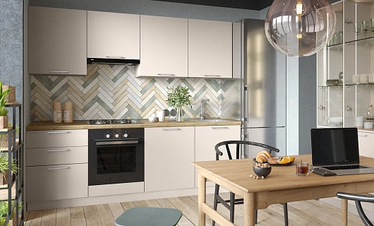 В каталоге Mr.Doors (г. Москва) есть бежевые кухни разных форматов. Ассортимент включает как модели для небольших пространств, так и мебель для просторных помещений. Каждый вариант может быть адаптирован по высоте, ширине, наполнению и стилю.