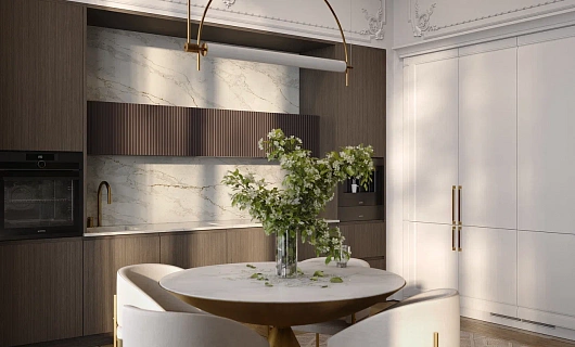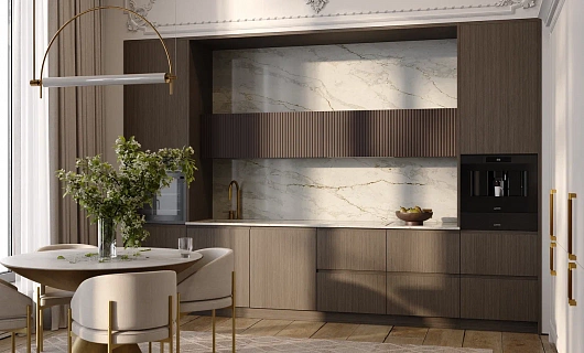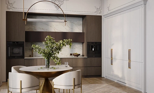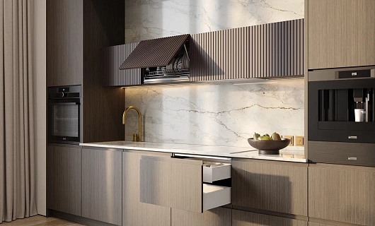 Кухни с интегрированной техникой — удобный формат, позволяющий создать аккуратное и визуально цельное пространство. Встроенные устройства не загромождают интерьер, располагаются в единой плоскости с фасадами, обеспечивают продуманную организацию рабочей зоны. Такой подход особенно ценен для квартир с ограниченной площадью и кухонь, объединенных с гостиной. Гарнитур с интегрированной техникой выглядит упорядоченно, помогает рационально использовать площадь, делает ежедневные задачи комфортнее.