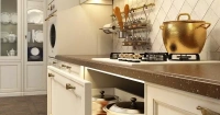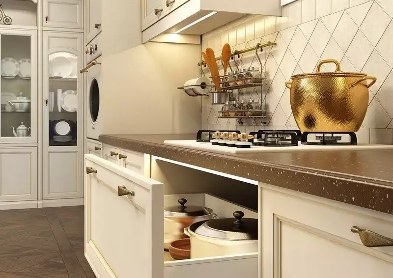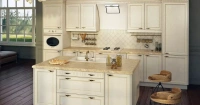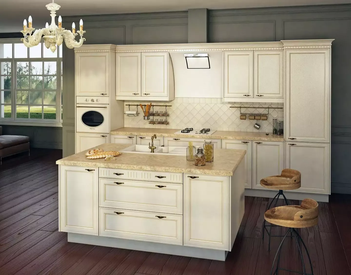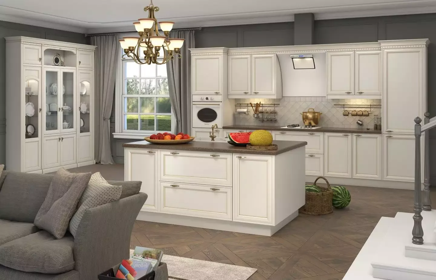 Классическая белая кухня с островом. Варочная панель, духовой шкаф и встроенный холодильник установлены в основной части, мойка и кран в островной. Кухня отличается большим количеством ящиков, что придется по душе любой хозяйке.