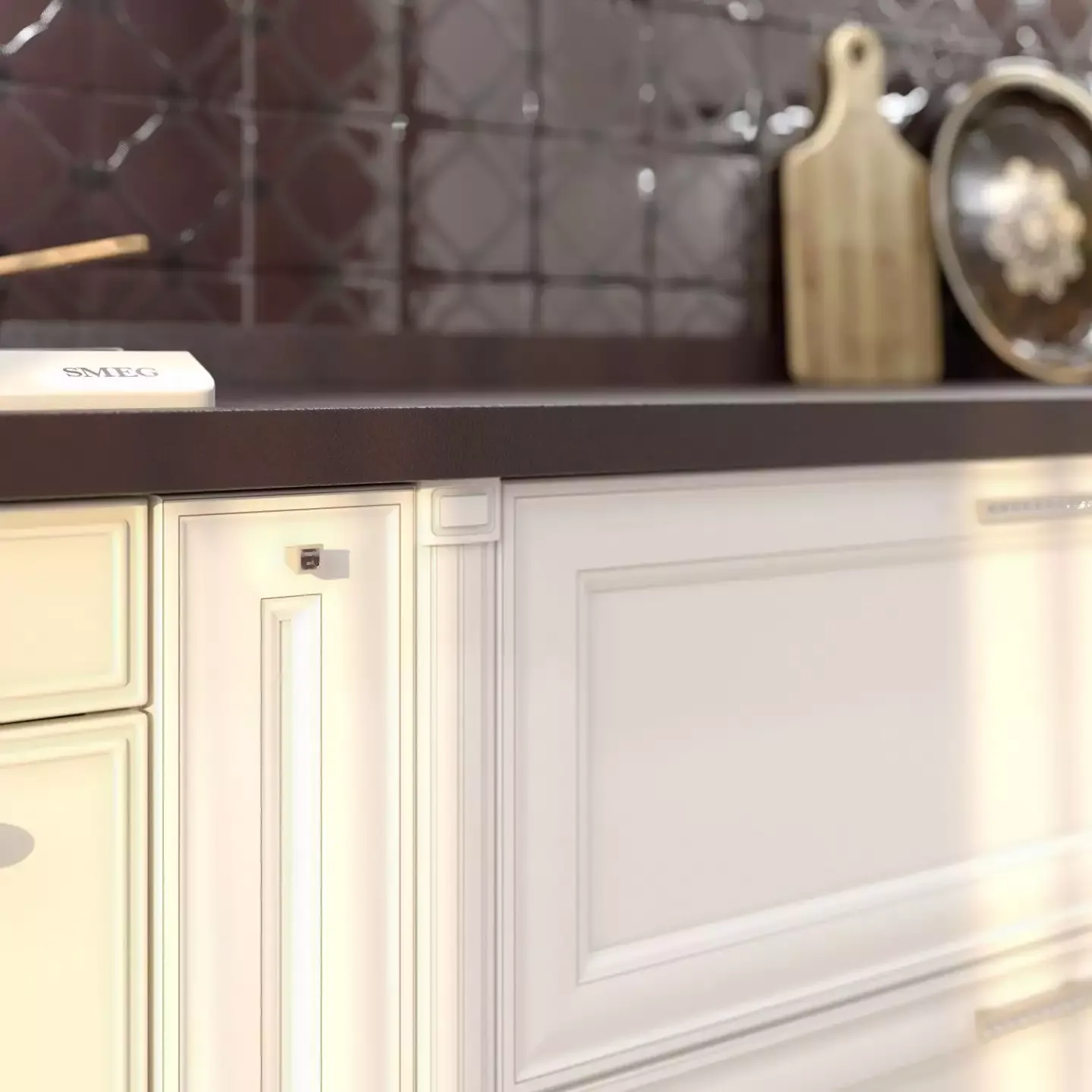Фасады серии «Итальянская классика», вставки из стекла «Севилья», вставки и сайды из ламинированных панелей «Декапе Арктик».