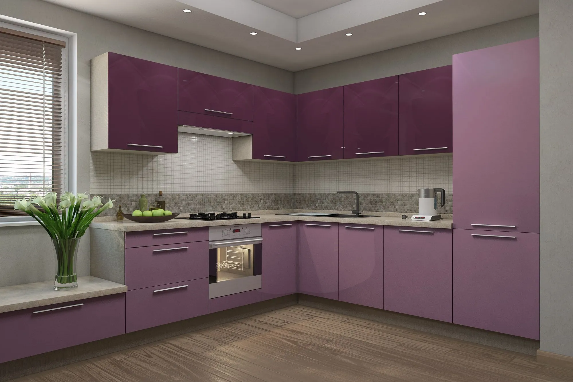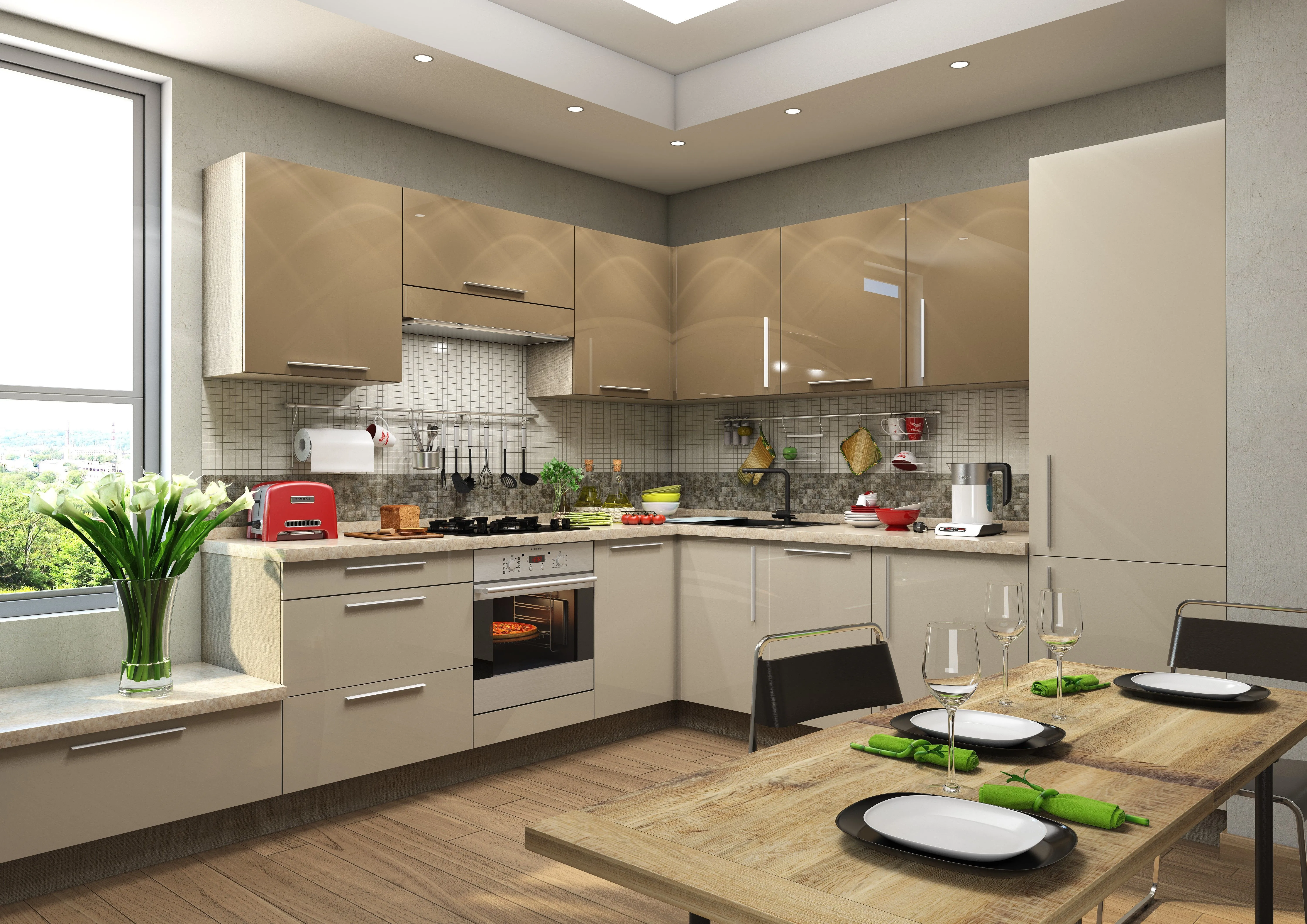 • Распашные безрамные фасады и откидной фасад над варочной поверхностью выполнены в высокоглянцевых пленках.
