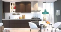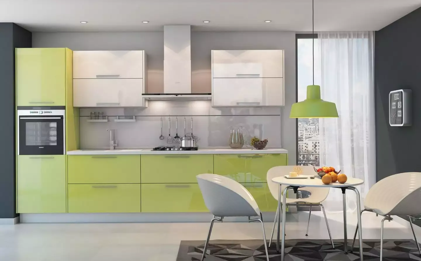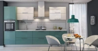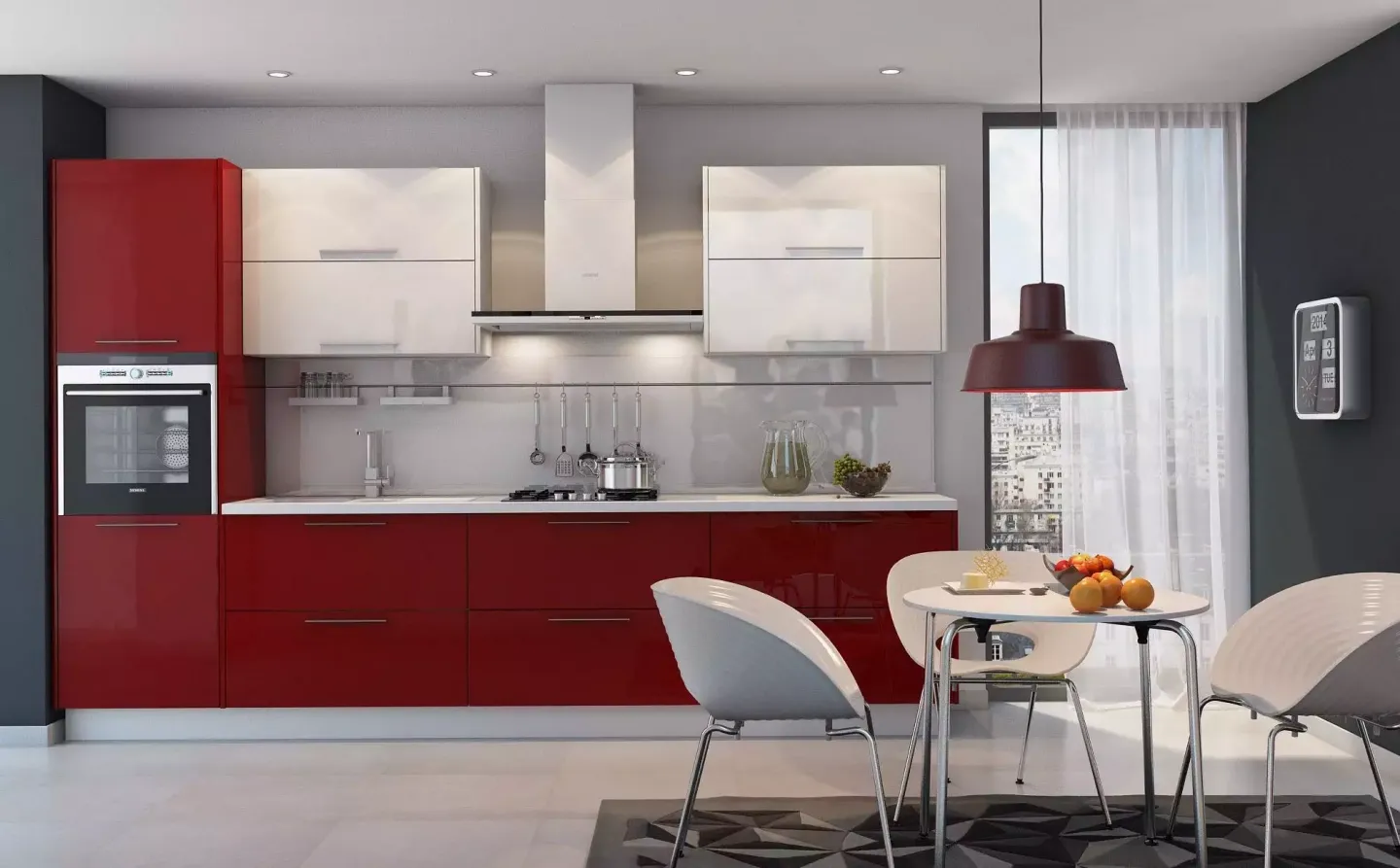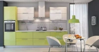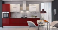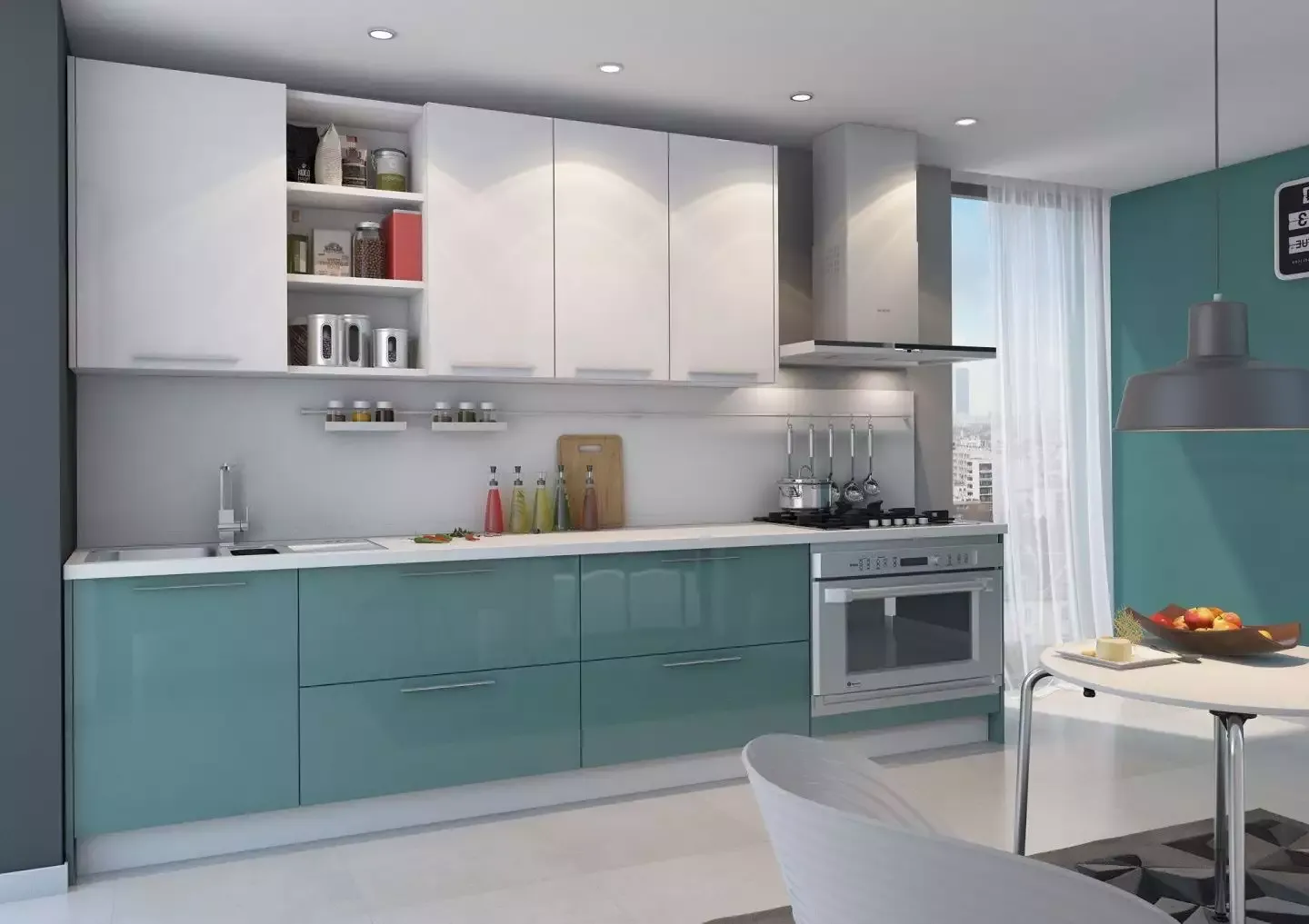 Небольшая прямая кухня в двухцветном исполнении. Декор верхних и нижних ящиков разный, как это иногда встречается в оформлении автомобилей. Кухня включает в себя все необходимые элементы и располагает достаточно большой рабочей поверхностью.