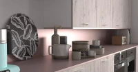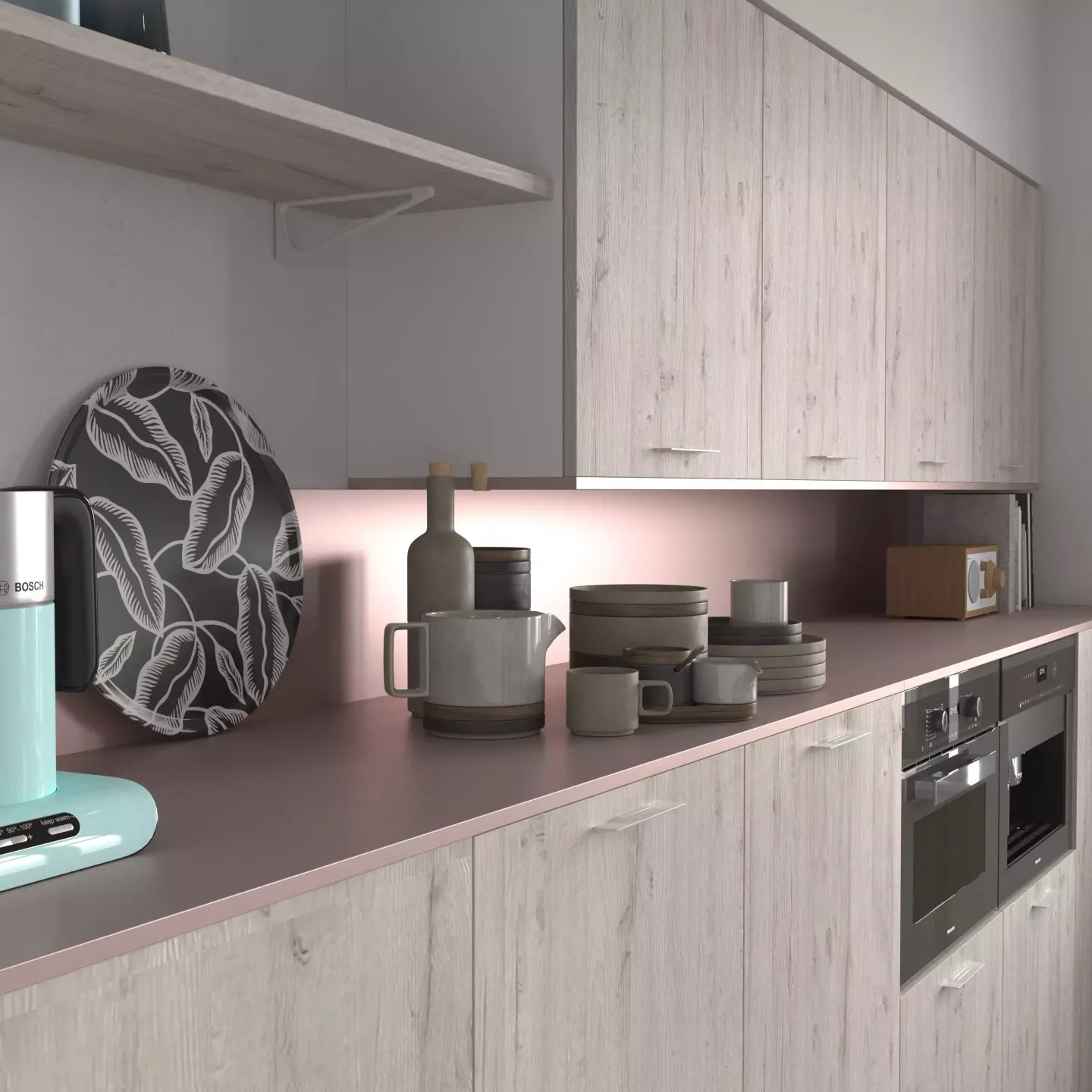 Фасады произведены из плиты TSS в декоре «Шервуд Аврора». Материал достоверно имитирует поверхность древесины, что обеспечивается наличием глубоких пор, естественного спила, ручной обработки. А также панели МДФ в плёнке «Матовая медь». Использованы ручки Slate и полкодержатели Алмеда белого цвета.