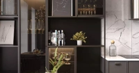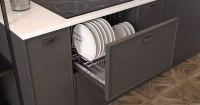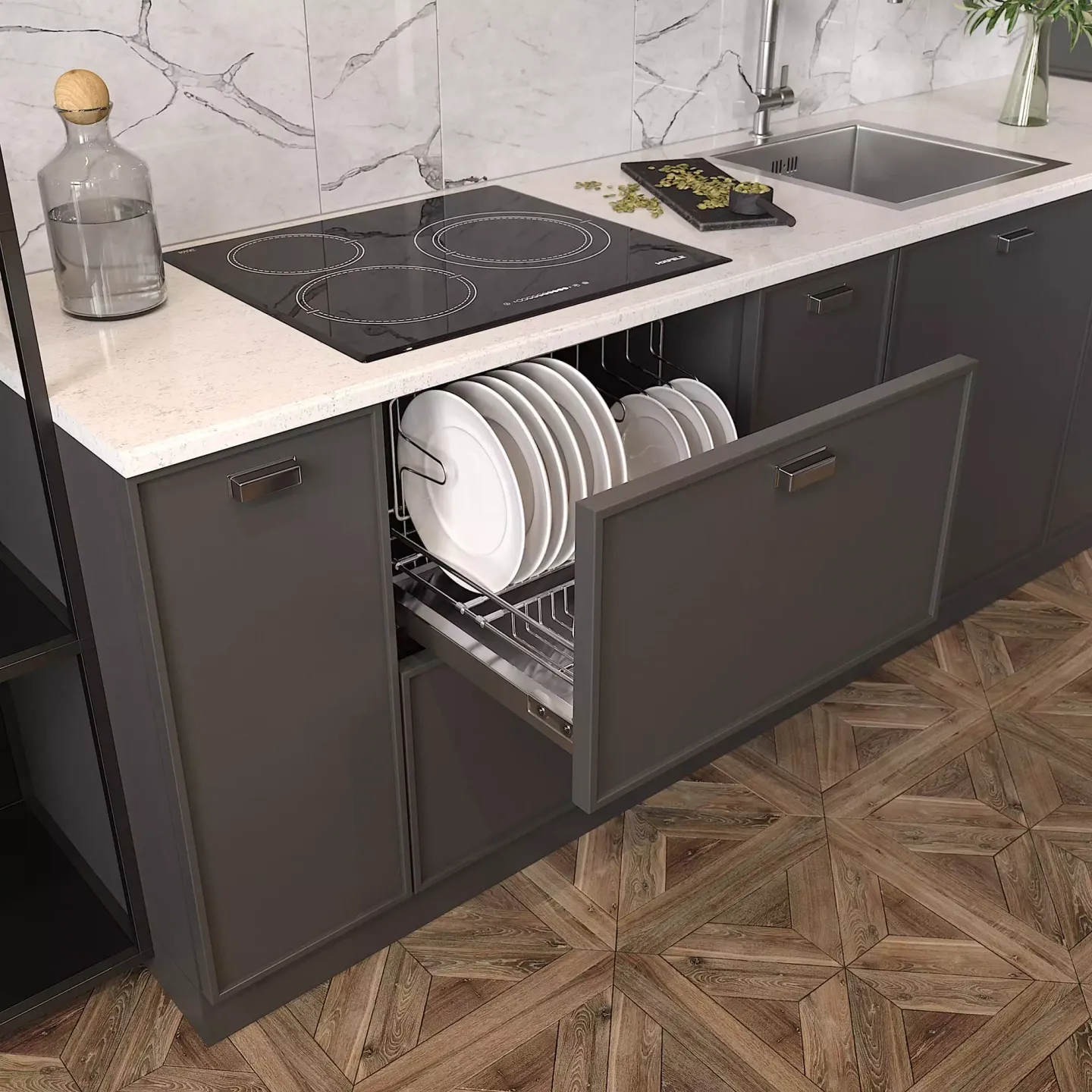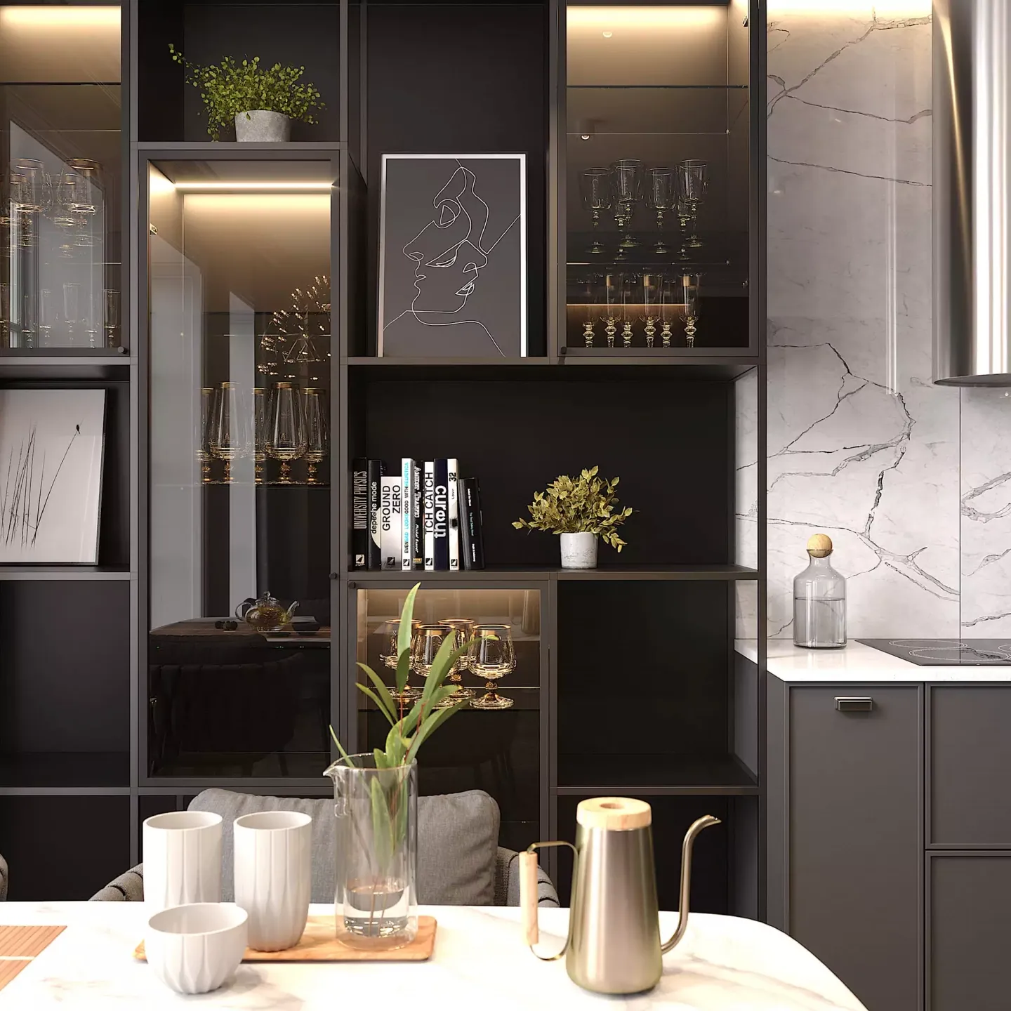 Глухие фасады «Трей» изготовлены из МДФ в плёнке «Урбан Графит». Тёмный оттенок изящно сочетается с декоративным стеклом «Агат», встроенным в фасады витринного шкафа «Джамп 20».
