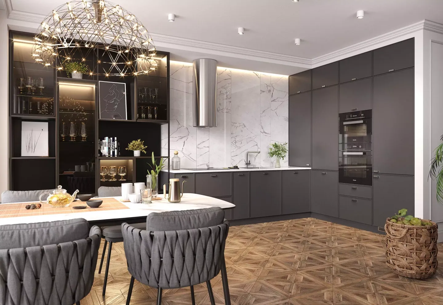 Корпусные элементы выполнены из ламинированной плиты в декоре «Ситивуд Чёрный». Тёплая светодиодная подсветка секций витринного шкафа делает кухню ещё более уютной. В проекте использованы ручки из коллекции «Урбан».