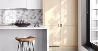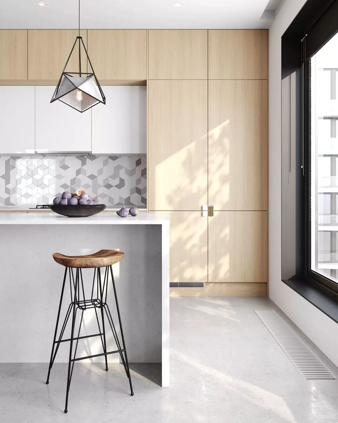 Корпусные и фасадные элементы «под дерево» сделаны из ламинированной плиты в декоре «Дуб Винченца». Белые фасады декорированы высокоглянцевой эмалью.
