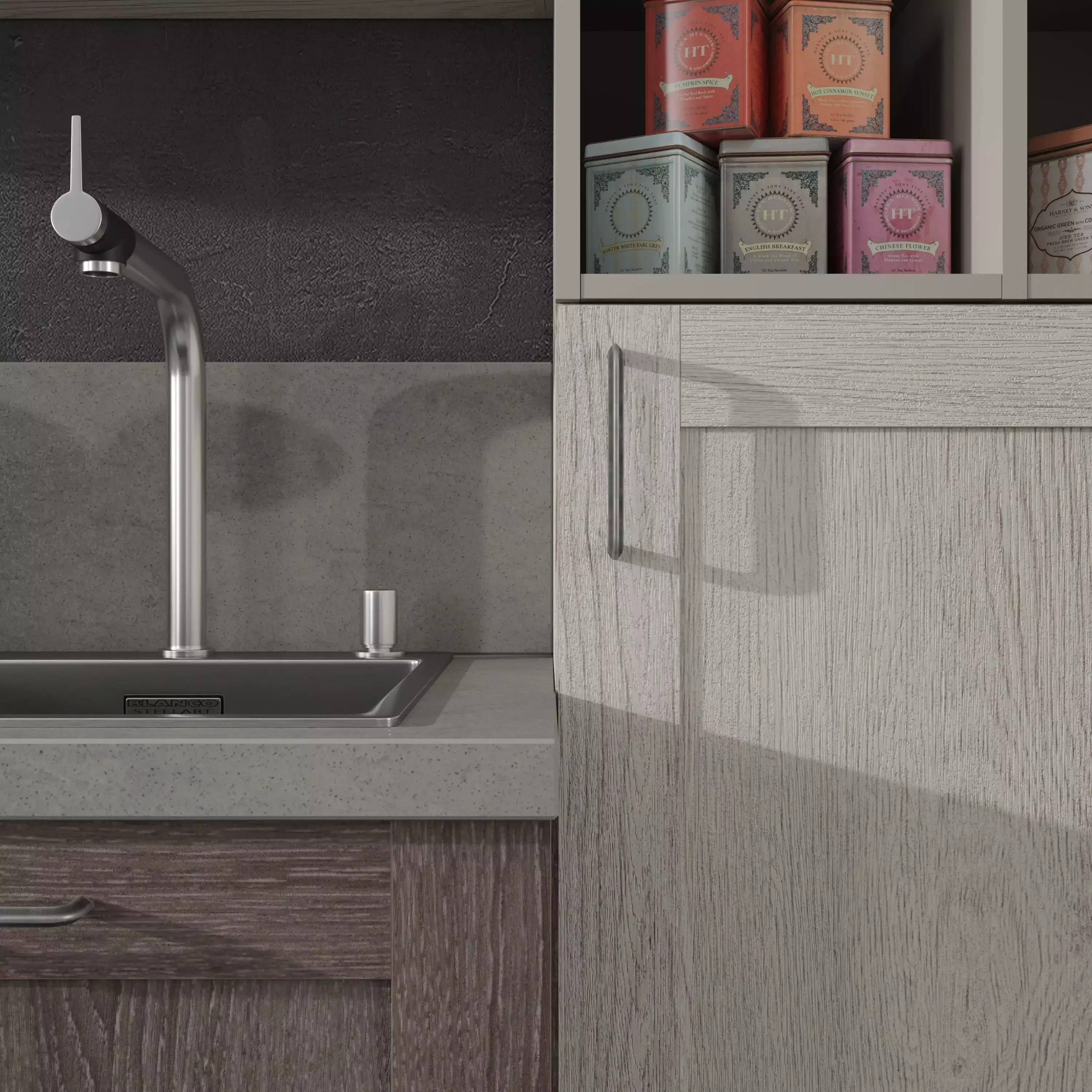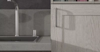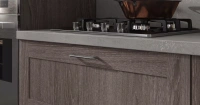 Открытая секция и цоколь изготовлен из плиты «Тауп». Столешница — из керамики Ceralan в декоре «Фавола григио». Ручки «Раккорди» делают композицию завершённой, к тому же, они удобны в использовании.