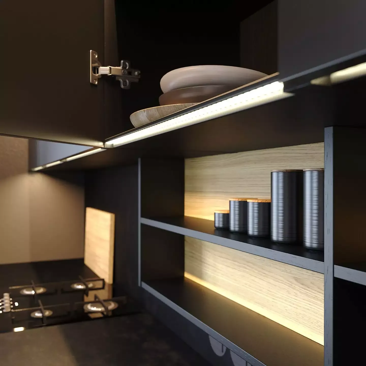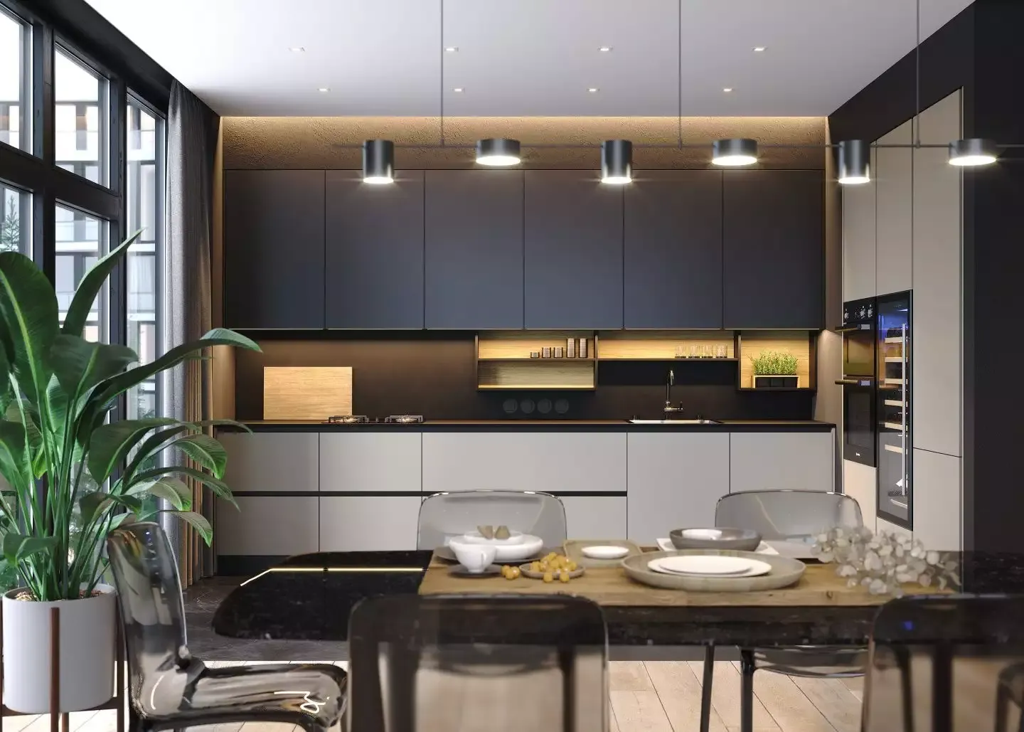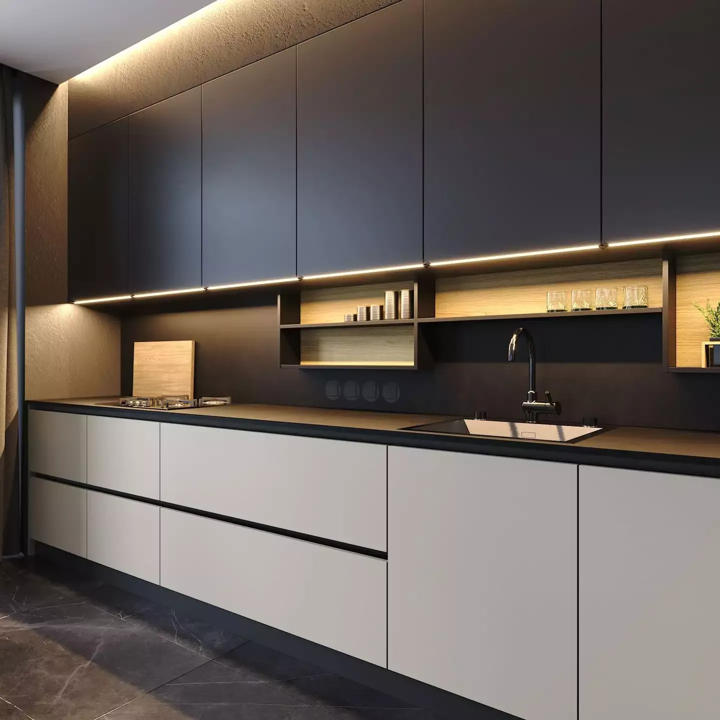 Строгая угловая кухня в темно тонах со встроенной подсветкой навесных ящиков. В декоре использовано много черных элементов. Между подвесными и напольными ящиками компактно устроены открытые ниши.