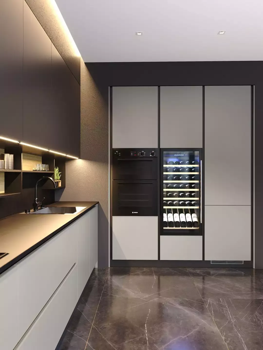Фасады нижних баз и колонок под технику справа выполнены в эмали «Сумерки».