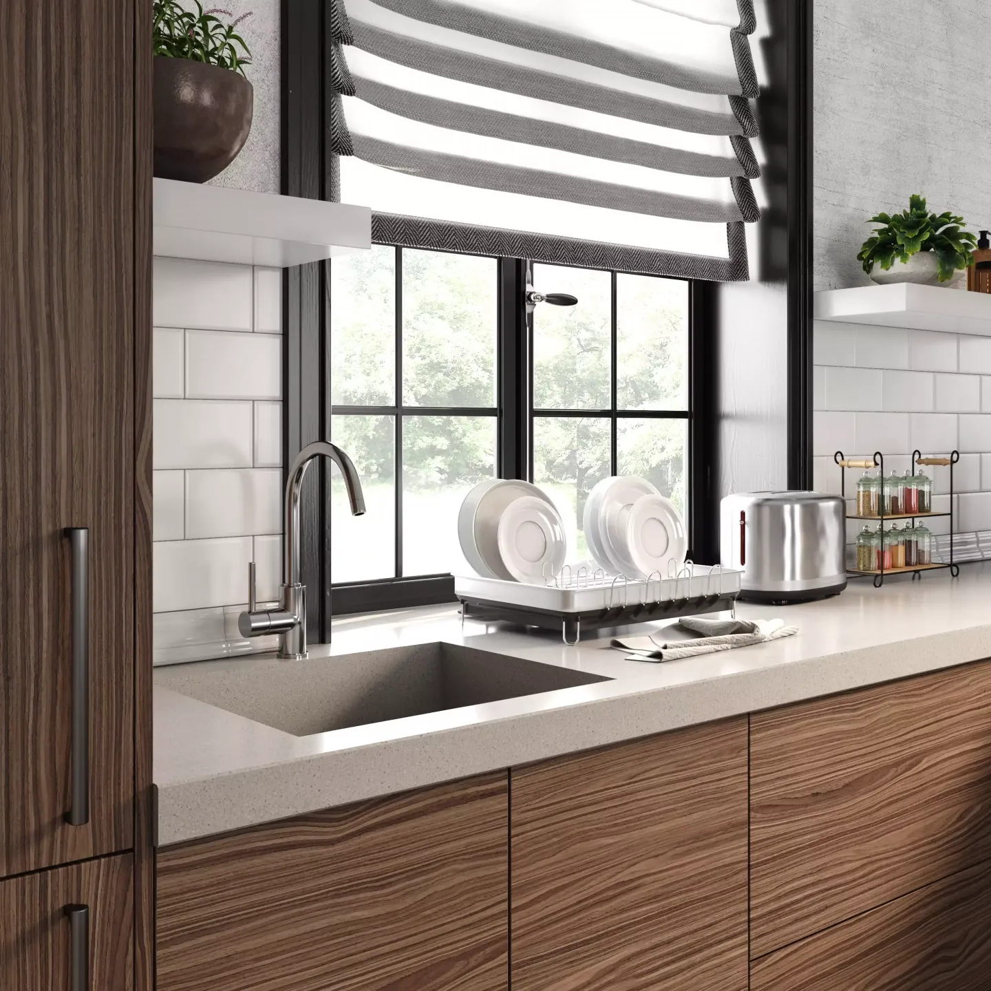 Подвесные ящики не предусмотрены, что позволяет размещать кухню по стене с окном.