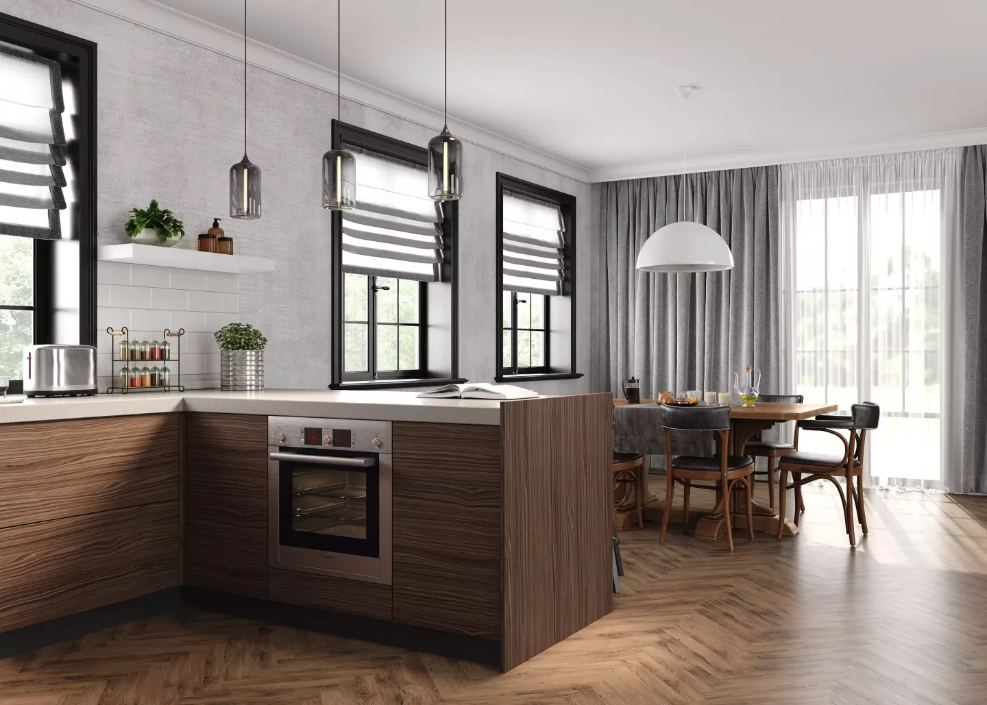 Кухня для загородного дома или квартиры студии. Проект выполнен в угловом исполнении, но в роли короткой части выступает барная стойка с одной стороны и встроенный духовой шкаф с другой. Такое расположение позволяет разделить зону кухни от, например, гостиной.