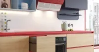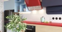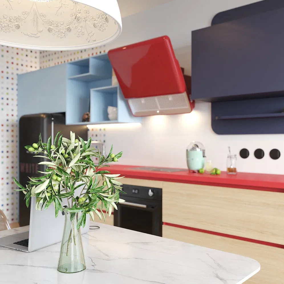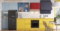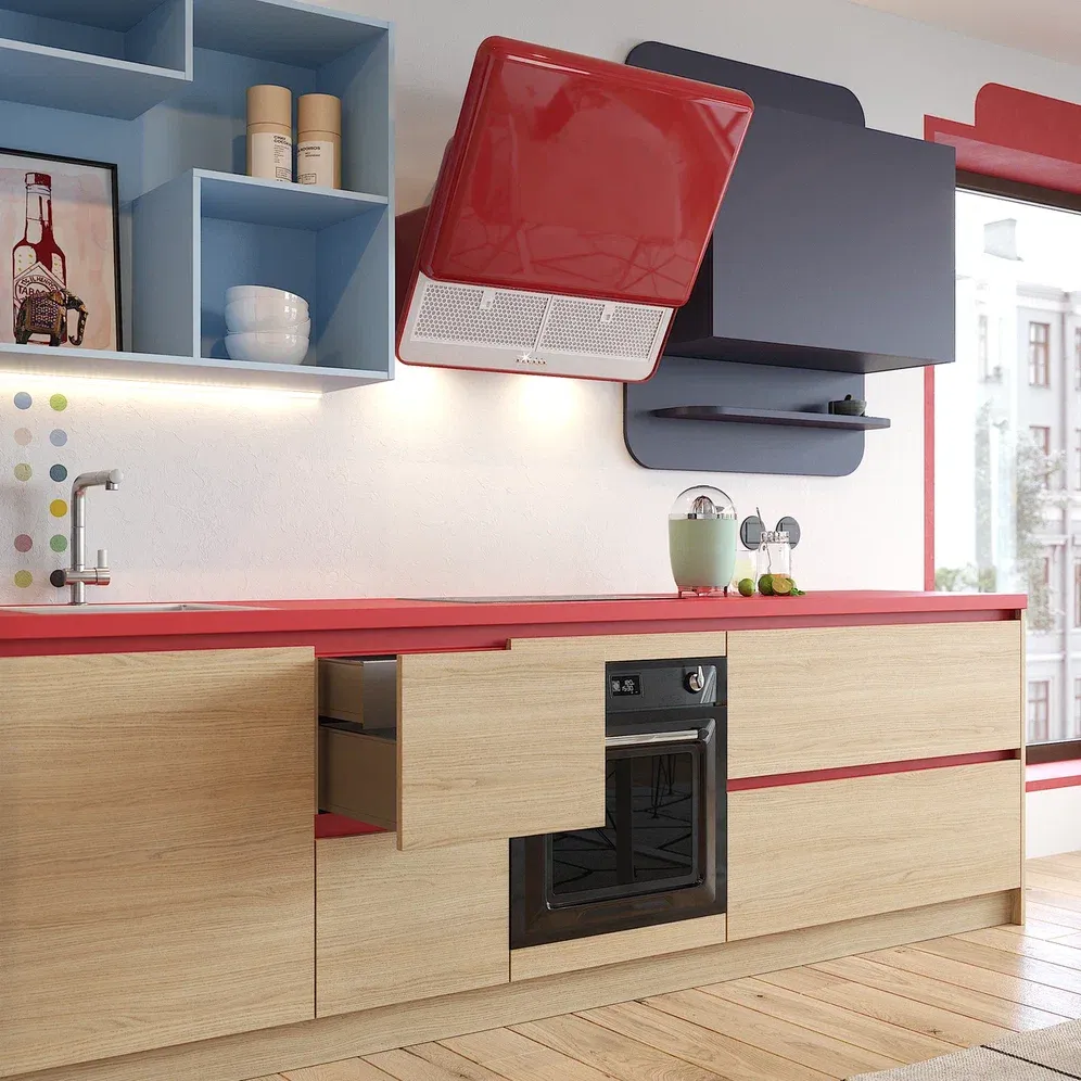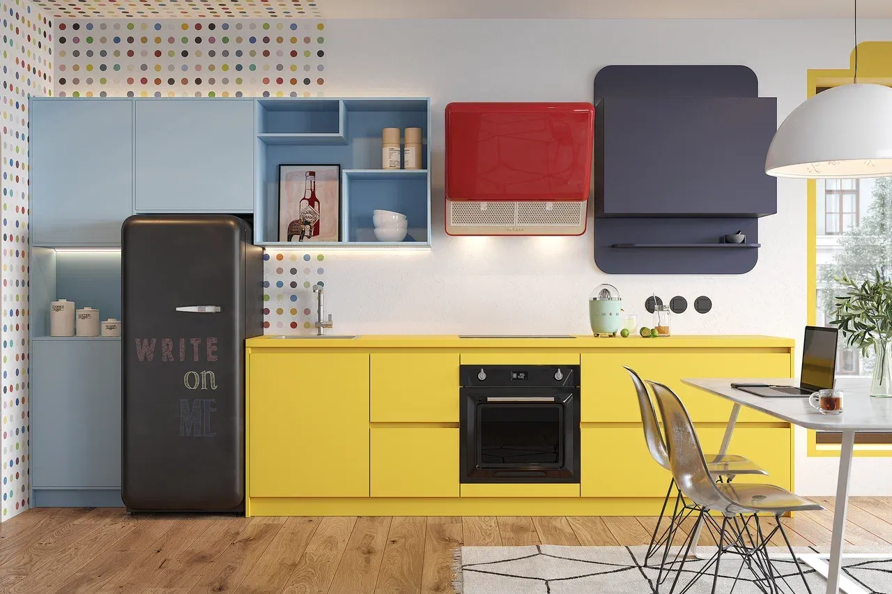 Небольшая молодежная кухня с яркими элементами для тех, кто не любит традиционные решения. Желтая столешница? Не вопрос! Синие подвесные ящики – легко. С этой кухней интерьер точно не заставит вас скучать. Она определенно производит впечатление