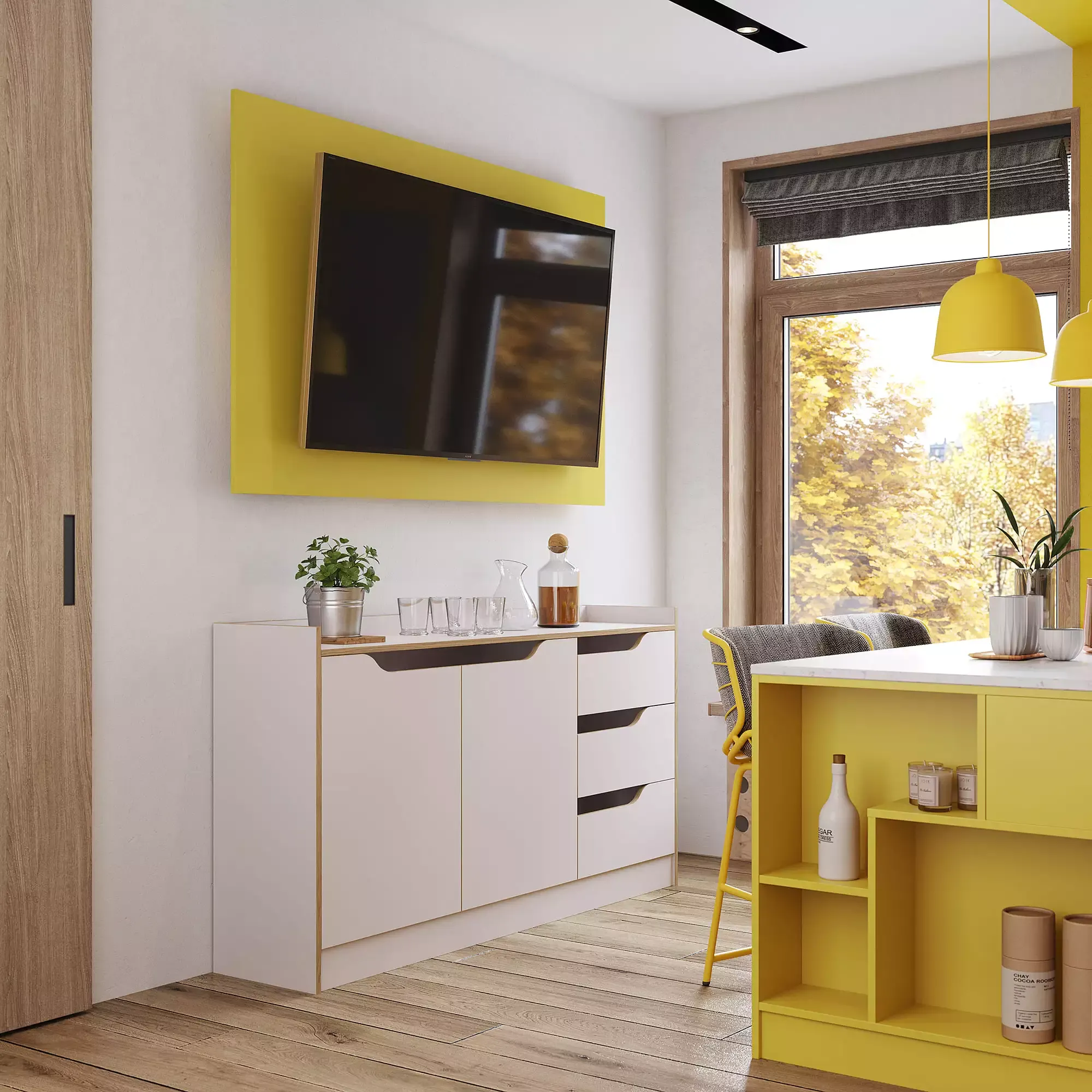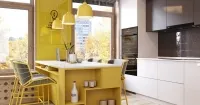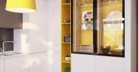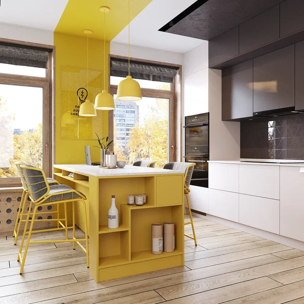 Солнечная кухня в современном стиле подойдёт как для отдельного помещения, так и для выделенной зоны в квартире-студии. В комплект мебели входит система хранения, колонна для техники, стеллаж, встроенный шкаф-витрина, а также ТВ-тумба с фигурными вырезами, которые заменяют ручки.