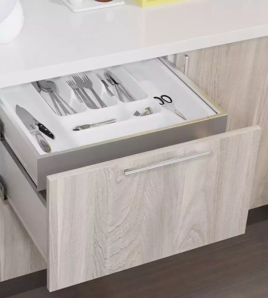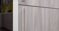 Безрамные фасады из TSS плиты Cleaf в декоре «Йосемити Шампань», верхние распашные фасады «Futur SX» со вставкой из декоративного пластика, декор «Лед белый».
