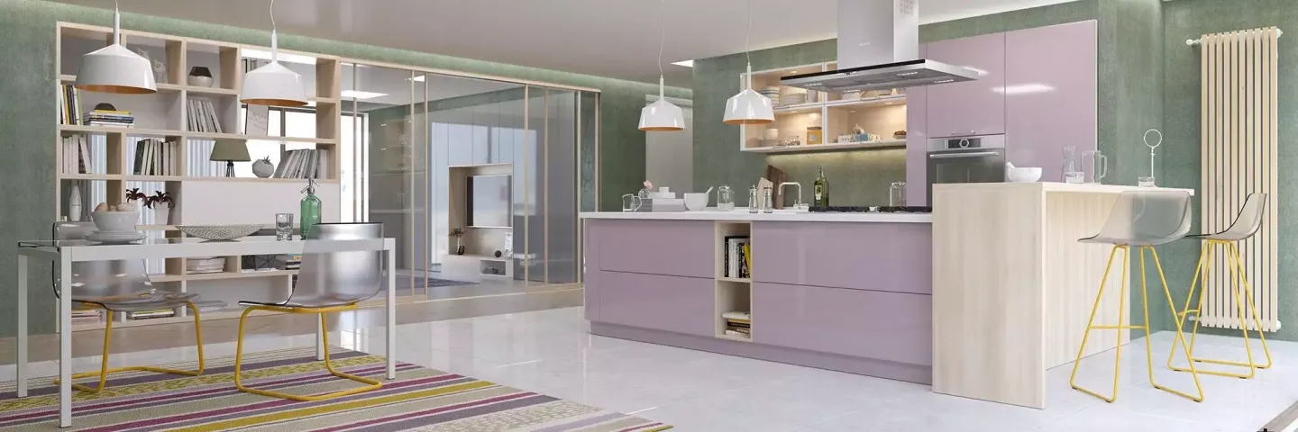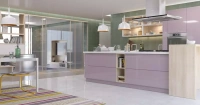 Лавандовый прямой гарнитур с островом. Кухня состоит из трех частей – зоны вдоль стены, в которую встроена бытовая техника и мойка, рабочей зоны в виде острова и барной стойки, соединяющий обе зоны. Интересный решением являются скругленные радиусные фасады угловых шкафов. Подвесные ящики имеют прозрачные дверцы.