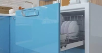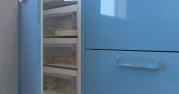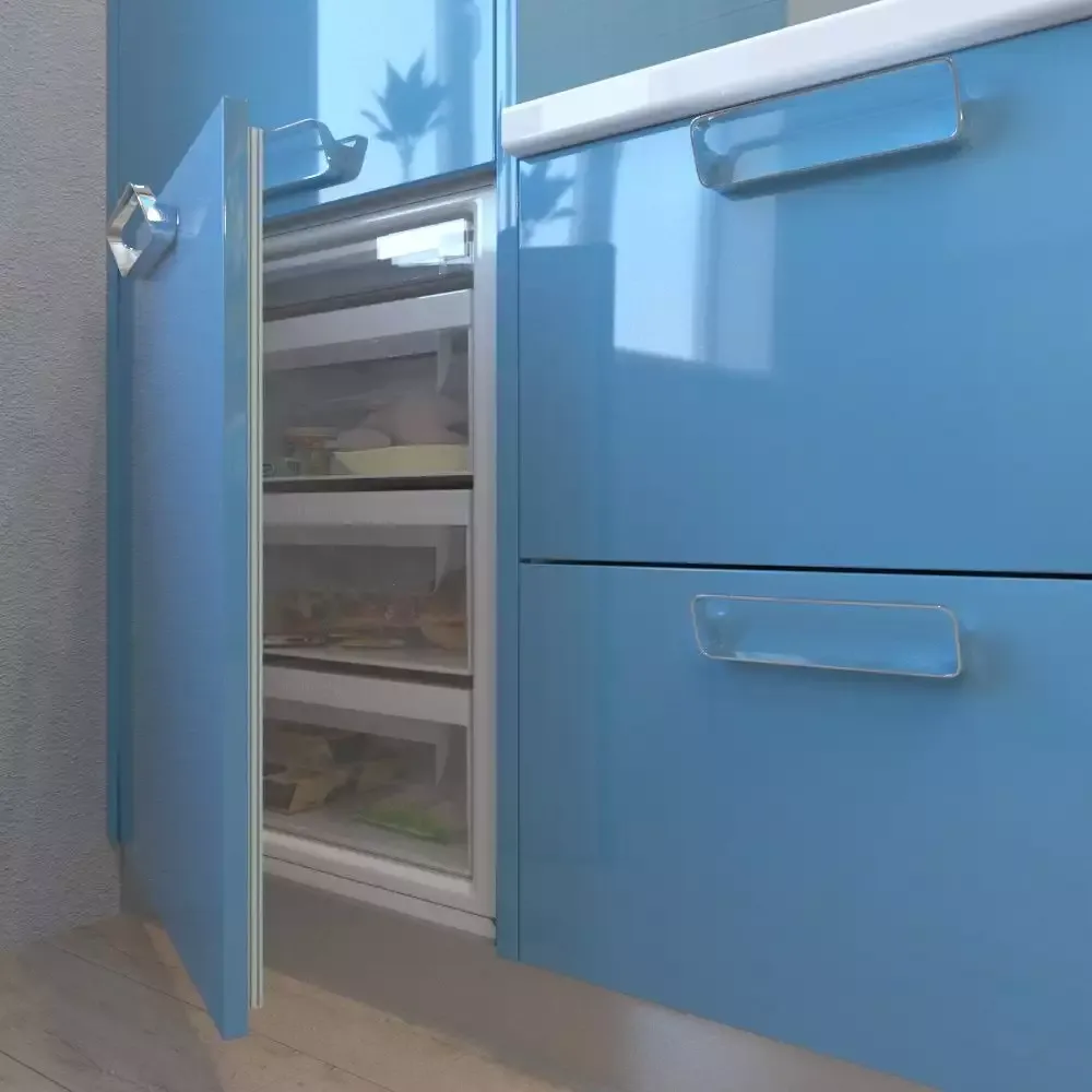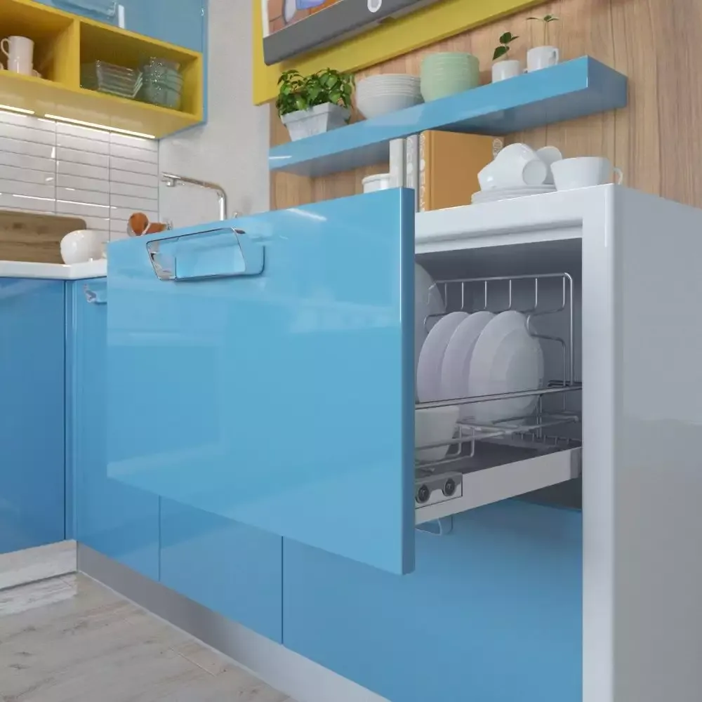 Современная угловая кухня в голубых тонах. В оформлении также используются желтые и красные фрагменты, что делает кухню яркой и интересной, ее можно назвать молодежной. Кухня прекрасно впишется в интерьер квартиры в стиле «модерн». Несмотря на свой игривый характер, она обладает вполне взрослыми возможностями и оснащением. А качество изготовления находится на самом высоком уровне.
